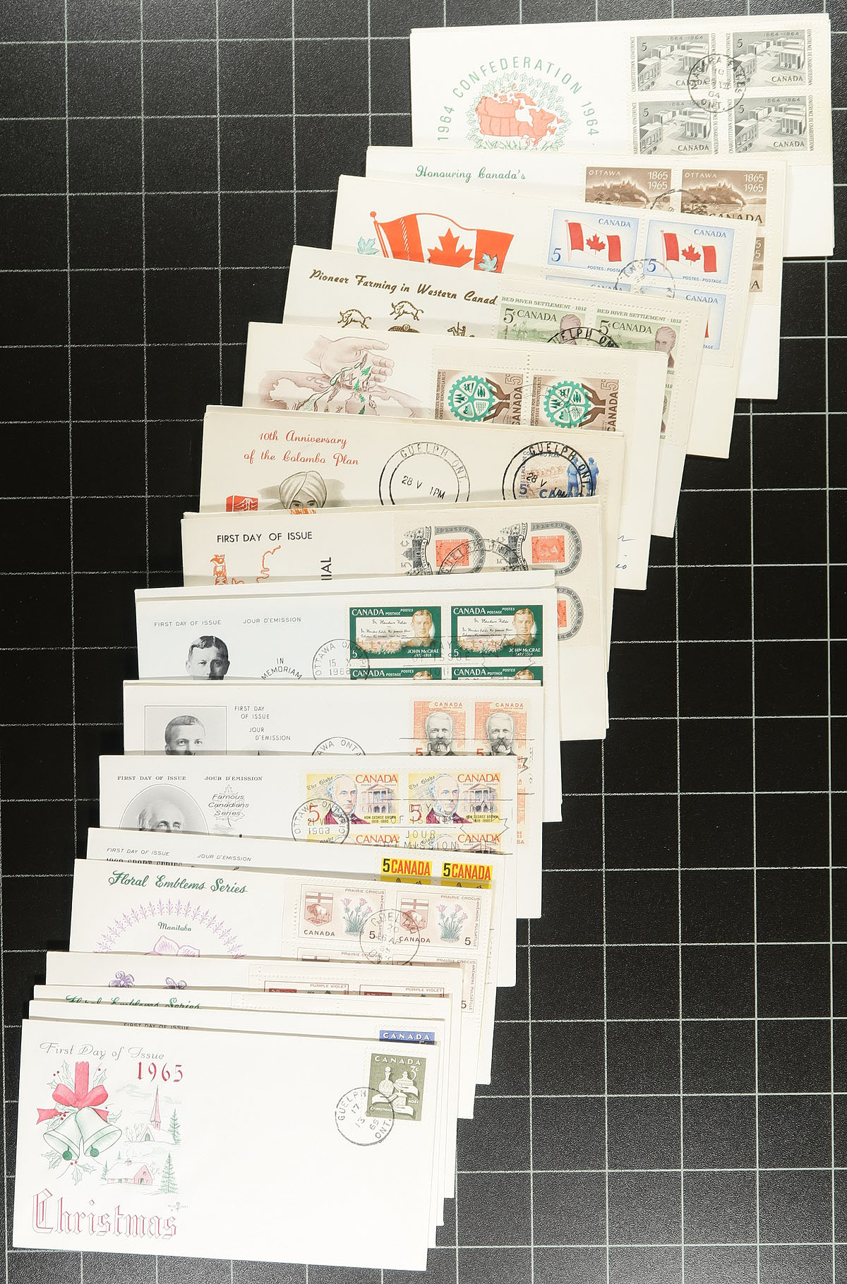 First Day Covers. Nice group of roughly 225 private cacheted first day covers, 1960's-1973, loose in a box, noting singles, pairs, blocks and sets frankings from makers Rose Craft, Capital, and Caneco in particular. A nice group of covers with some mild duplication within, overall fine to very fine. Estimate =