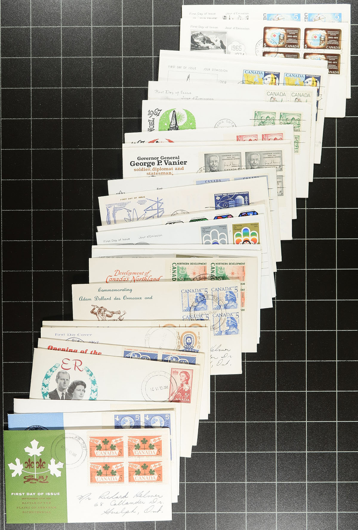 First Day Covers. Nice group of roughly 225 private cacheted first day covers, 1960's-1973, loose in a box, noting singles, pairs, blocks and sets frankings from makers Rose Craft, Capital, and Caneco in particular. A nice group of covers with some mild duplication within, overall fine to very fine. Estimate =
