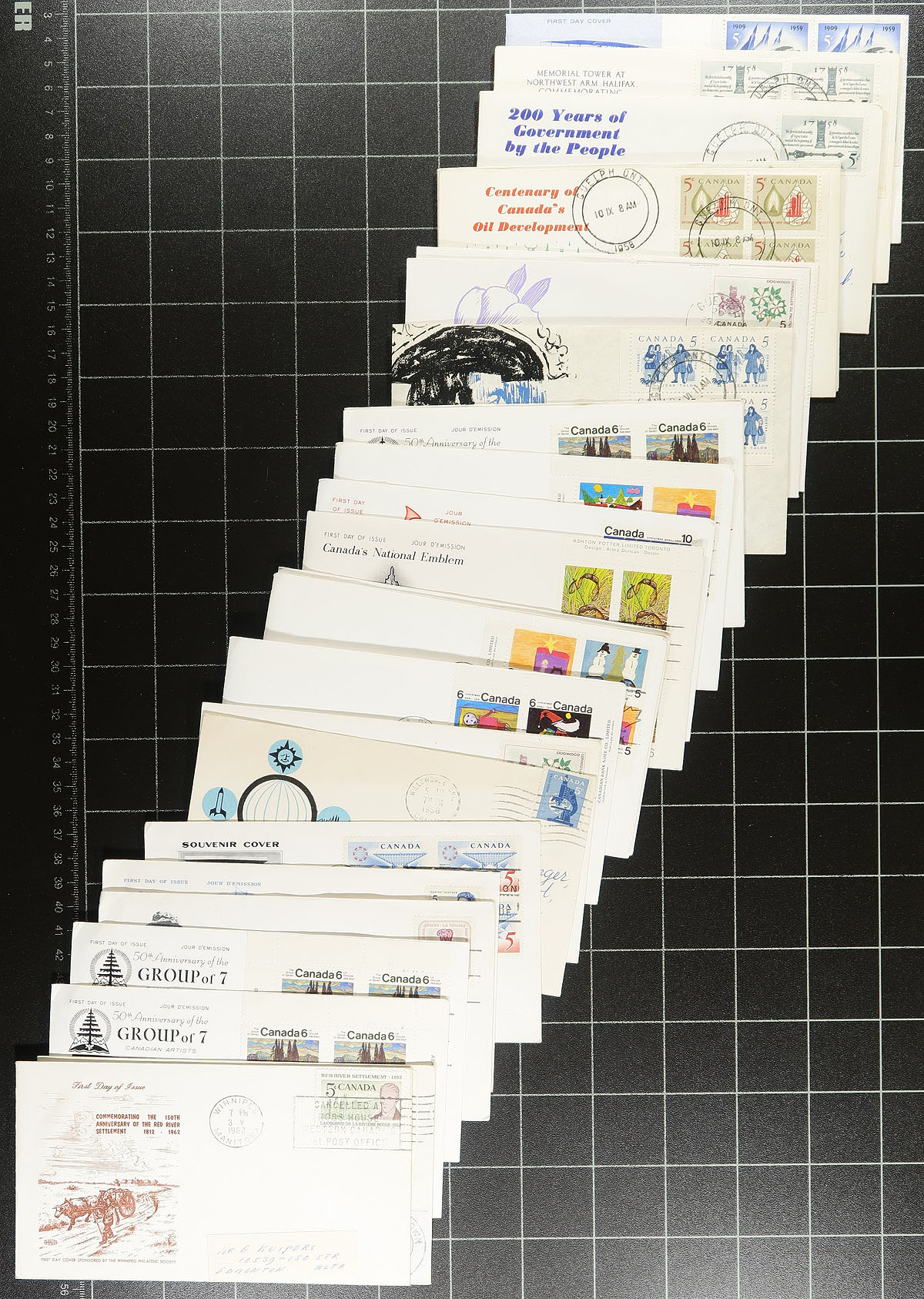 First Day Covers. Nice group of roughly 225 private cacheted first day covers, 1960's-1973, loose in a box, noting singles, pairs, blocks and sets frankings from makers Rose Craft, Capital, and Caneco in particular. A nice group of covers with some mild duplication within, overall fine to very fine. Estimate =