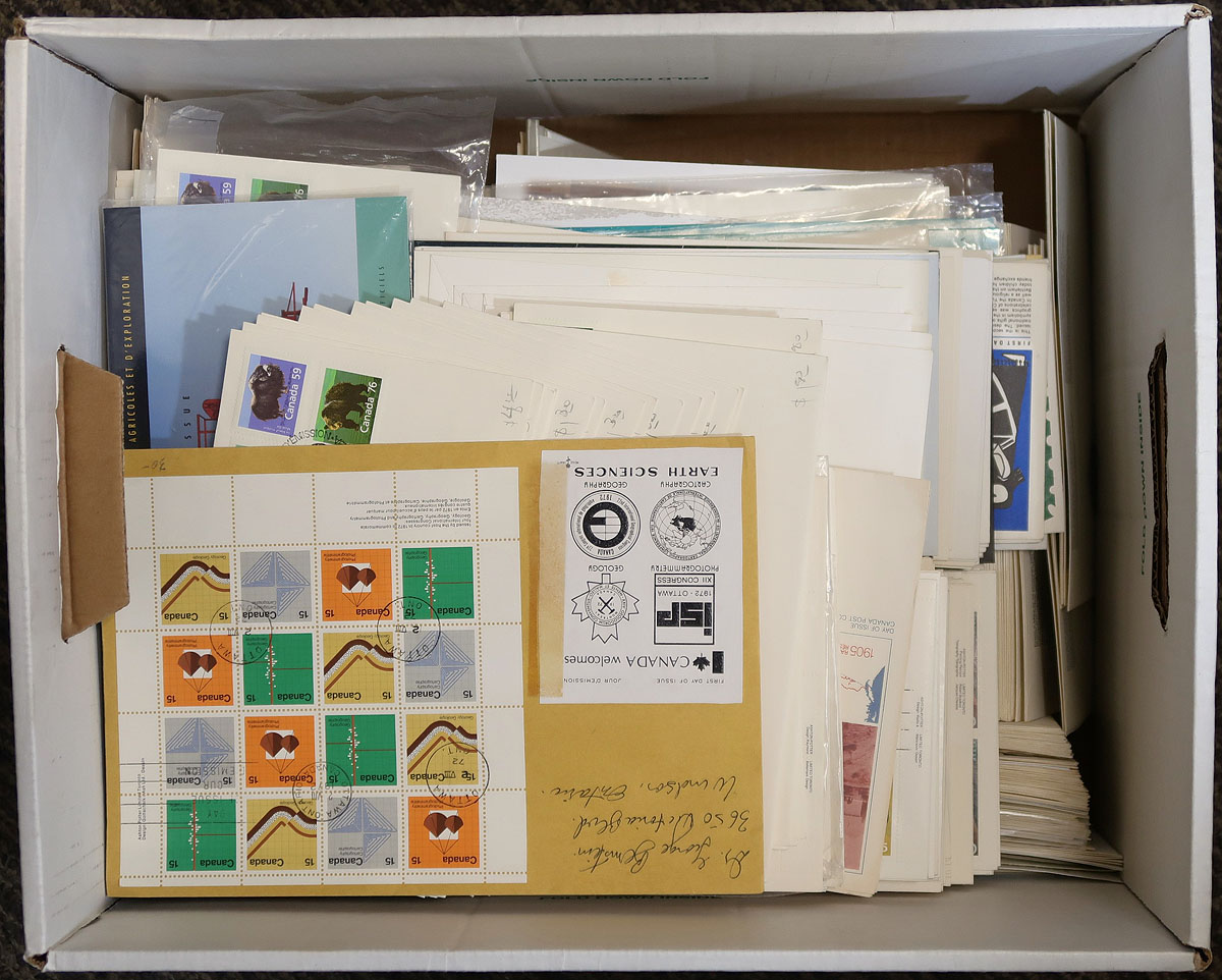 First Day Covers. Accumulation of roughly 700 first day covers, 1950's-1990's. We note a good variety of items noting singles, sets, blocks, plate blocks, souvenir sheet, and high denomination frankings, along with some private cachet covers, some pre-1970 uncacheted covers, large sized envelopes and more. A nice group for collectors and dealers alike, overall very fine. Estimate =