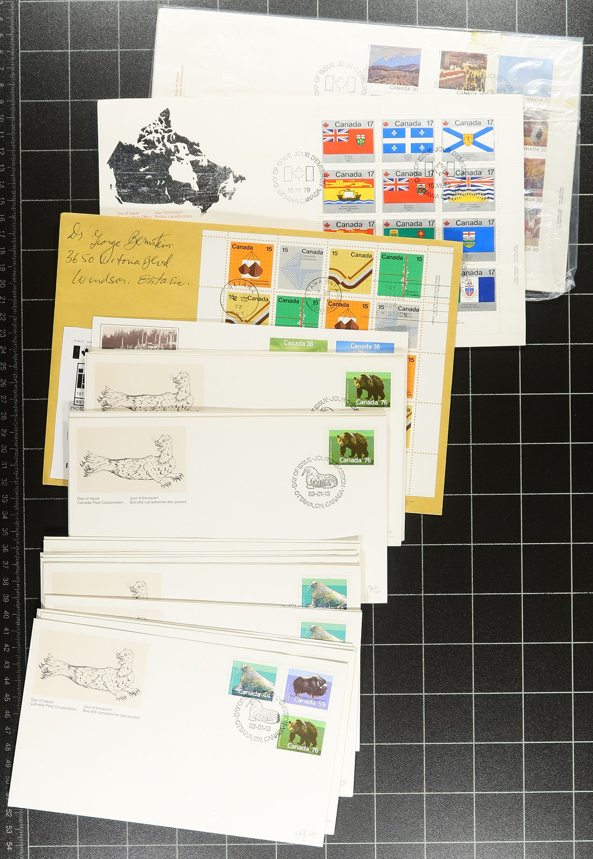 First Day Covers. Accumulation of roughly 700 first day covers, 1950's-1990's. We note a good variety of items noting singles, sets, blocks, plate blocks, souvenir sheet, and high denomination frankings, along with some private cachet covers, some pre-1970 uncacheted covers, large sized envelopes and more. A nice group for collectors and dealers alike, overall very fine. Estimate =