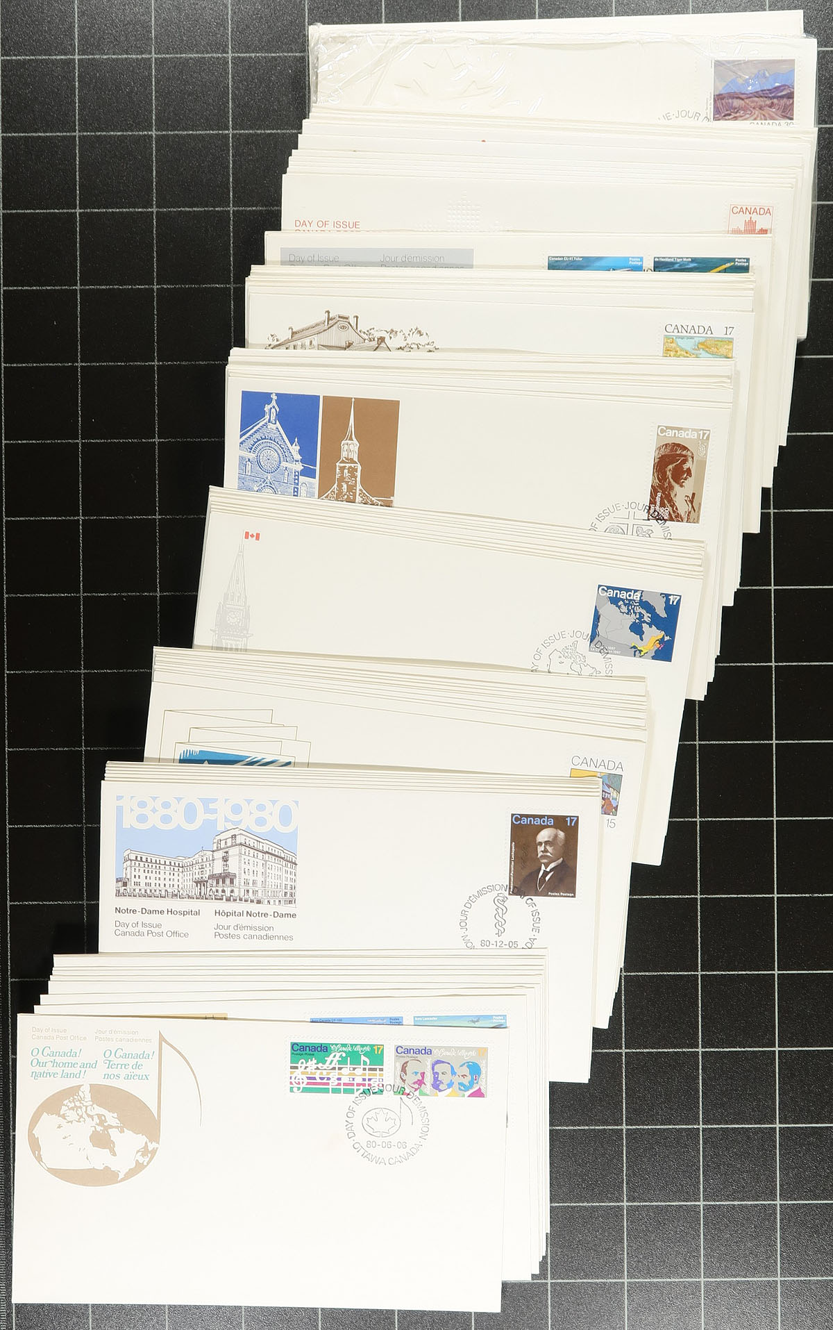 First Day Covers. Accumulation of roughly 700 first day covers, 1950's-1990's. We note a good variety of items noting singles, sets, blocks, plate blocks, souvenir sheet, and high denomination frankings, along with some private cachet covers, some pre-1970 uncacheted covers, large sized envelopes and more. A nice group for collectors and dealers alike, overall very fine. Estimate =