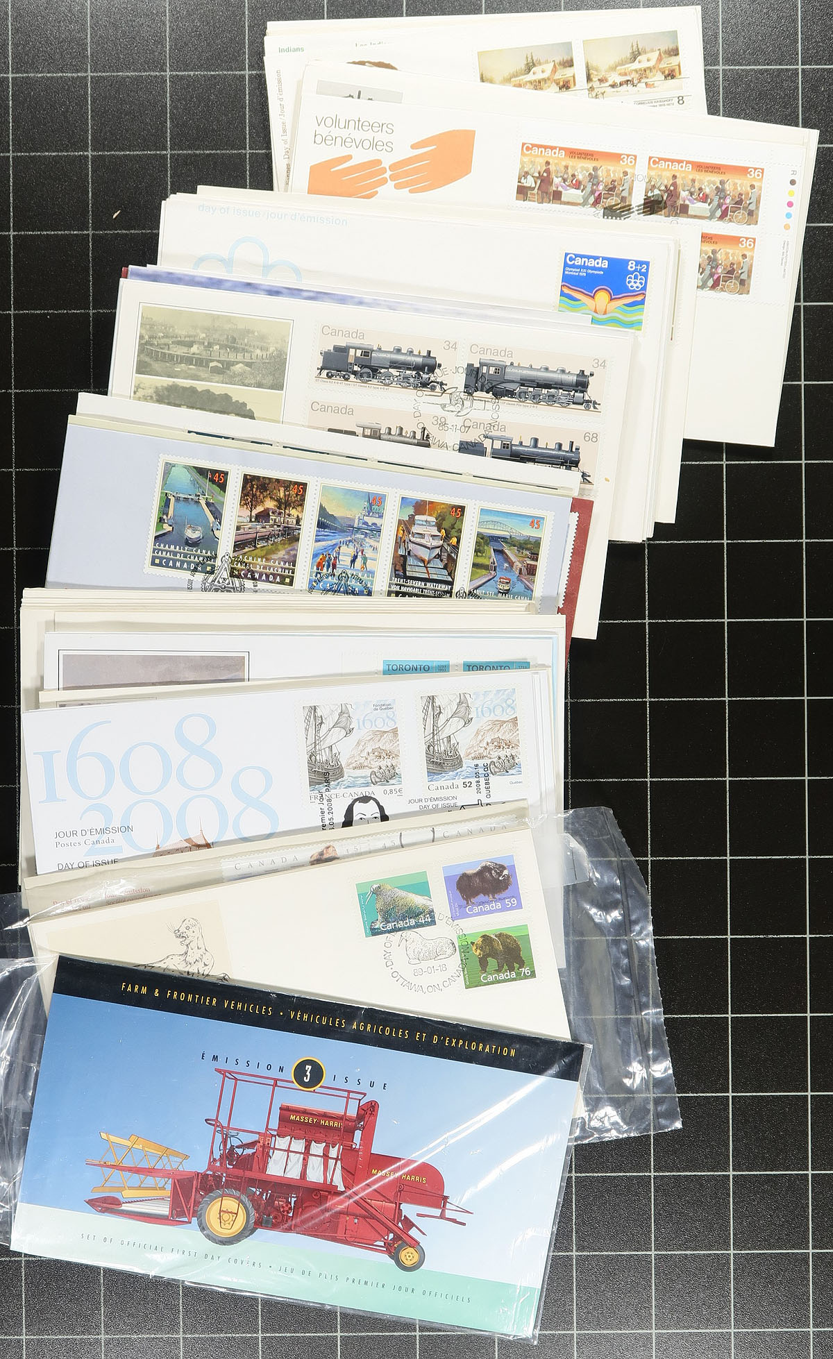 First Day Covers. Accumulation of roughly 700 first day covers, 1950's-1990's. We note a good variety of items noting singles, sets, blocks, plate blocks, souvenir sheet, and high denomination frankings, along with some private cachet covers, some pre-1970 uncacheted covers, large sized envelopes and more. A nice group for collectors and dealers alike, overall very fine. Estimate =