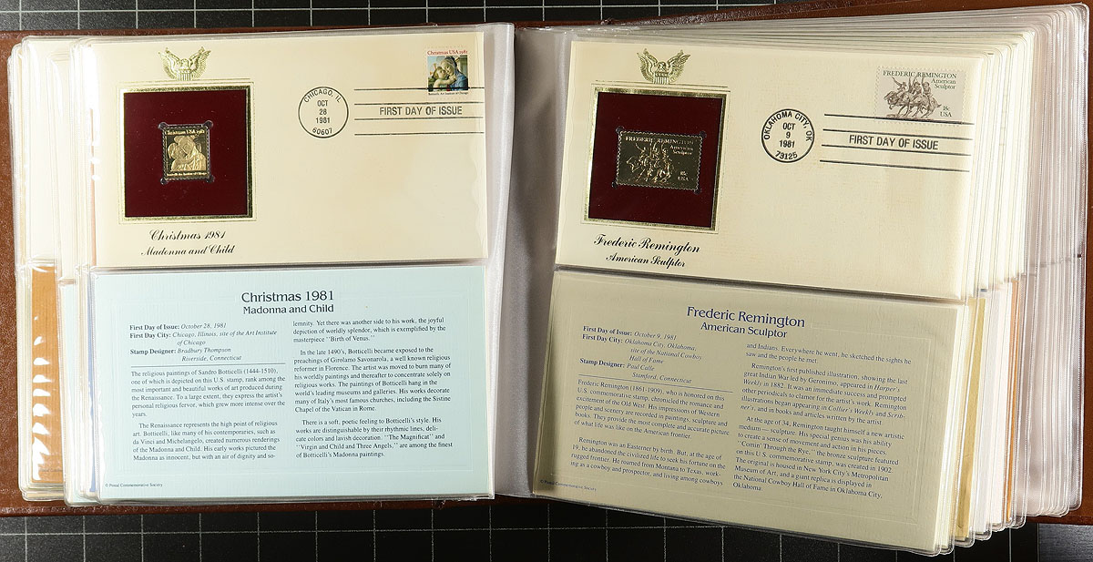 Nice thematic collections "The Golden Replicas of the United States" in 4 volumes, containing roughly 250 different covers with issues from the 1980's. A clean group and ideal for the United States or thematic / topical collector. Estimate =