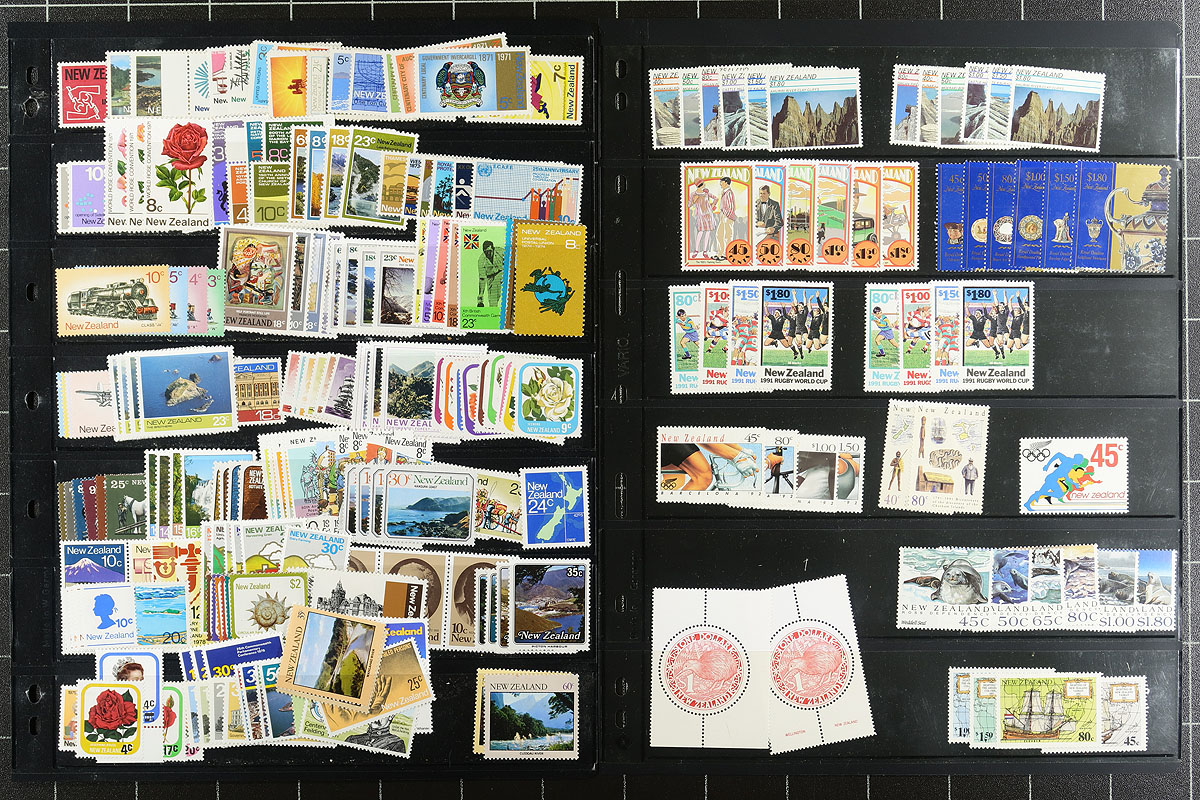 Lovely collection / accumulation of primarily never hinged New Zealand, 1936-2005, containing roughly 1,100 stamps in 20 stock pages. The lot generally ranges from Scott #218/2052, containing primarily sets, along with souvenir sheets, several blocks, and back of the book issues. A spot check indicated some material cataloguing $10 and up, with the owner's 2008 Scott catalogue value for the lot totaling US$1,379.00 ($1861.65 CDN). A nice clean lot for collectors (noting several suitable thematic and topical subjects), and dealers looking for stock. Estimate =