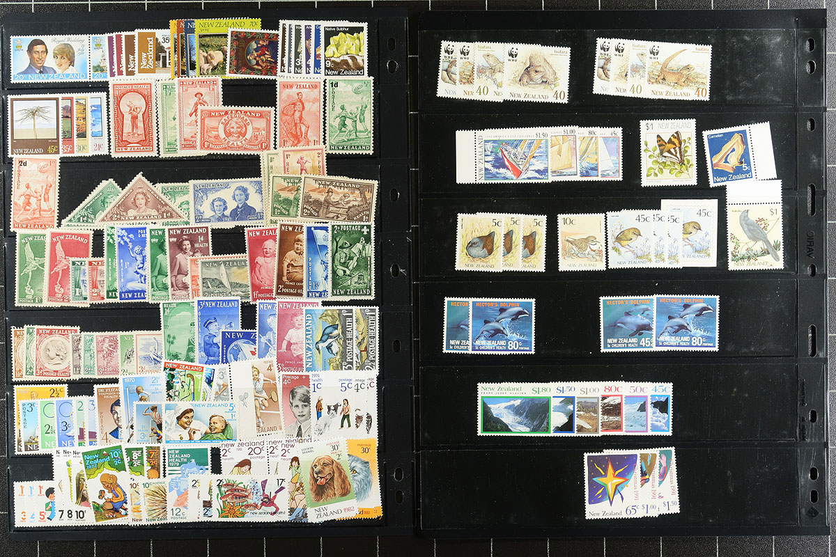Lovely collection / accumulation of primarily never hinged New Zealand, 1936-2005, containing roughly 1,100 stamps in 20 stock pages. The lot generally ranges from Scott #218/2052, containing primarily sets, along with souvenir sheets, several blocks, and back of the book issues. A spot check indicated some material cataloguing $10 and up, with the owner's 2008 Scott catalogue value for the lot totaling US$1,379.00 ($1861.65 CDN). A nice clean lot for collectors (noting several suitable thematic and topical subjects), and dealers looking for stock. Estimate =