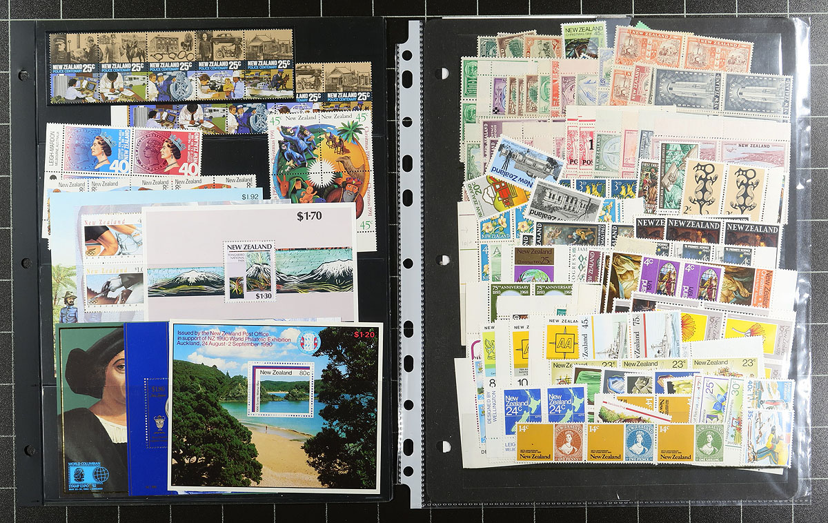 Lovely collection / accumulation of primarily never hinged New Zealand, 1936-2005, containing roughly 1,100 stamps in 20 stock pages. The lot generally ranges from Scott #218/2052, containing primarily sets, along with souvenir sheets, several blocks, and back of the book issues. A spot check indicated some material cataloguing $10 and up, with the owner's 2008 Scott catalogue value for the lot totaling US$1,379.00 ($1861.65 CDN). A nice clean lot for collectors (noting several suitable thematic and topical subjects), and dealers looking for stock. Estimate =