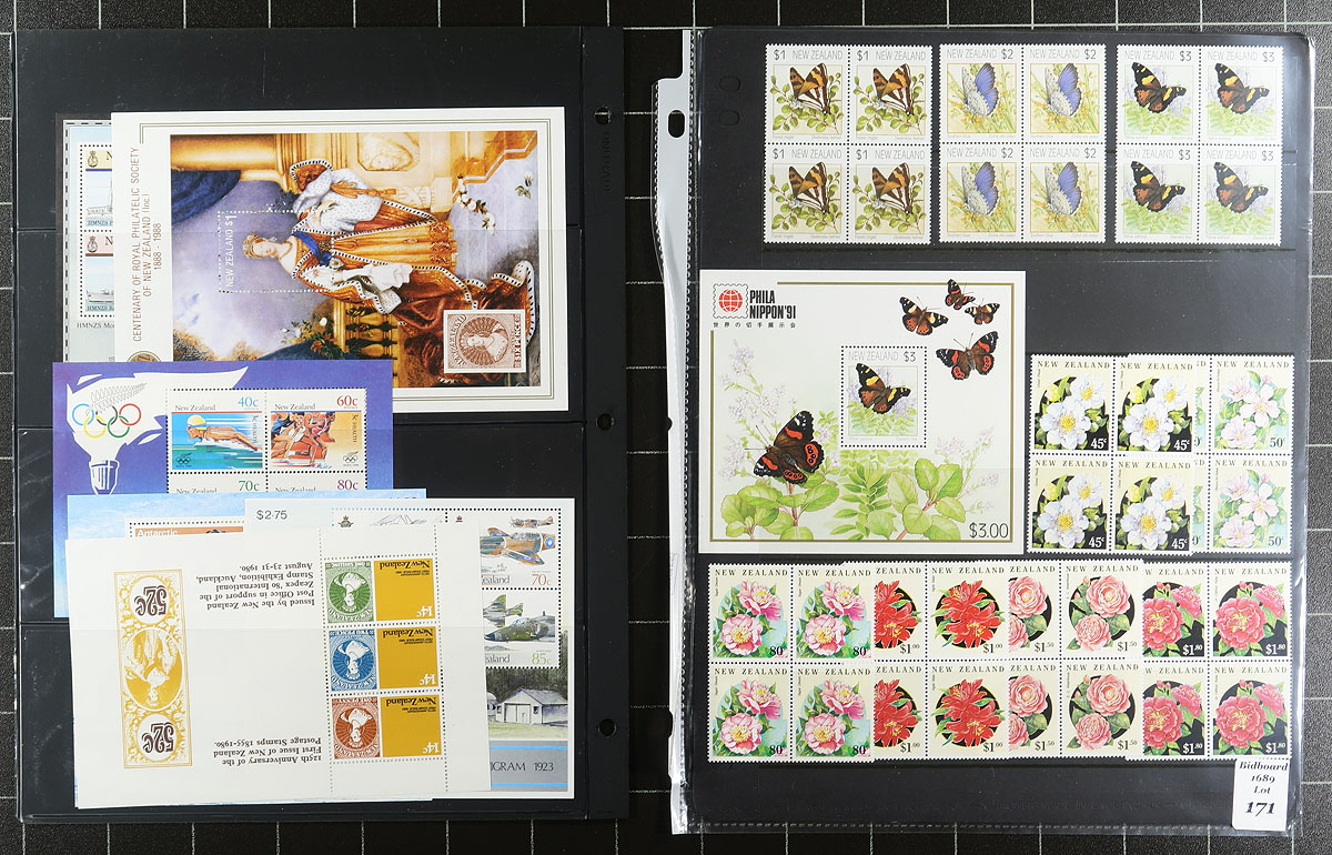 Lovely collection / accumulation of primarily never hinged New Zealand, 1936-2005, containing roughly 1,100 stamps in 20 stock pages. The lot generally ranges from Scott #218/2052, containing primarily sets, along with souvenir sheets, several blocks, and back of the book issues. A spot check indicated some material cataloguing $10 and up, with the owner's 2008 Scott catalogue value for the lot totaling US$1,379.00 ($1861.65 CDN). A nice clean lot for collectors (noting several suitable thematic and topical subjects), and dealers looking for stock. Estimate =