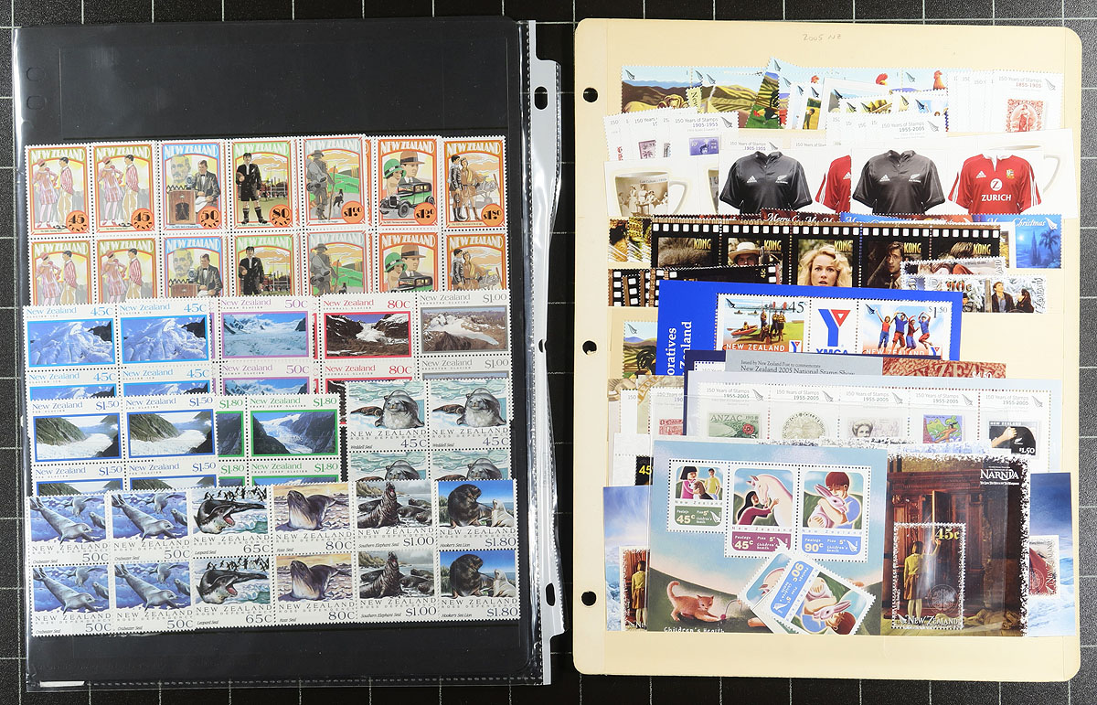 Lovely collection / accumulation of primarily never hinged New Zealand, 1936-2005, containing roughly 1,100 stamps in 20 stock pages. The lot generally ranges from Scott #218/2052, containing primarily sets, along with souvenir sheets, several blocks, and back of the book issues. A spot check indicated some material cataloguing $10 and up, with the owner's 2008 Scott catalogue value for the lot totaling US$1,379.00 ($1861.65 CDN). A nice clean lot for collectors (noting several suitable thematic and topical subjects), and dealers looking for stock. Estimate =