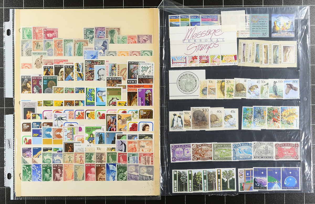 Lovely collection / accumulation of primarily never hinged New Zealand, 1936-2005, containing roughly 1,100 stamps in 20 stock pages. The lot generally ranges from Scott #218/2052, containing primarily sets, along with souvenir sheets, several blocks, and back of the book issues. A spot check indicated some material cataloguing $10 and up, with the owner's 2008 Scott catalogue value for the lot totaling US$1,379.00 ($1861.65 CDN). A nice clean lot for collectors (noting several suitable thematic and topical subjects), and dealers looking for stock. Estimate =
