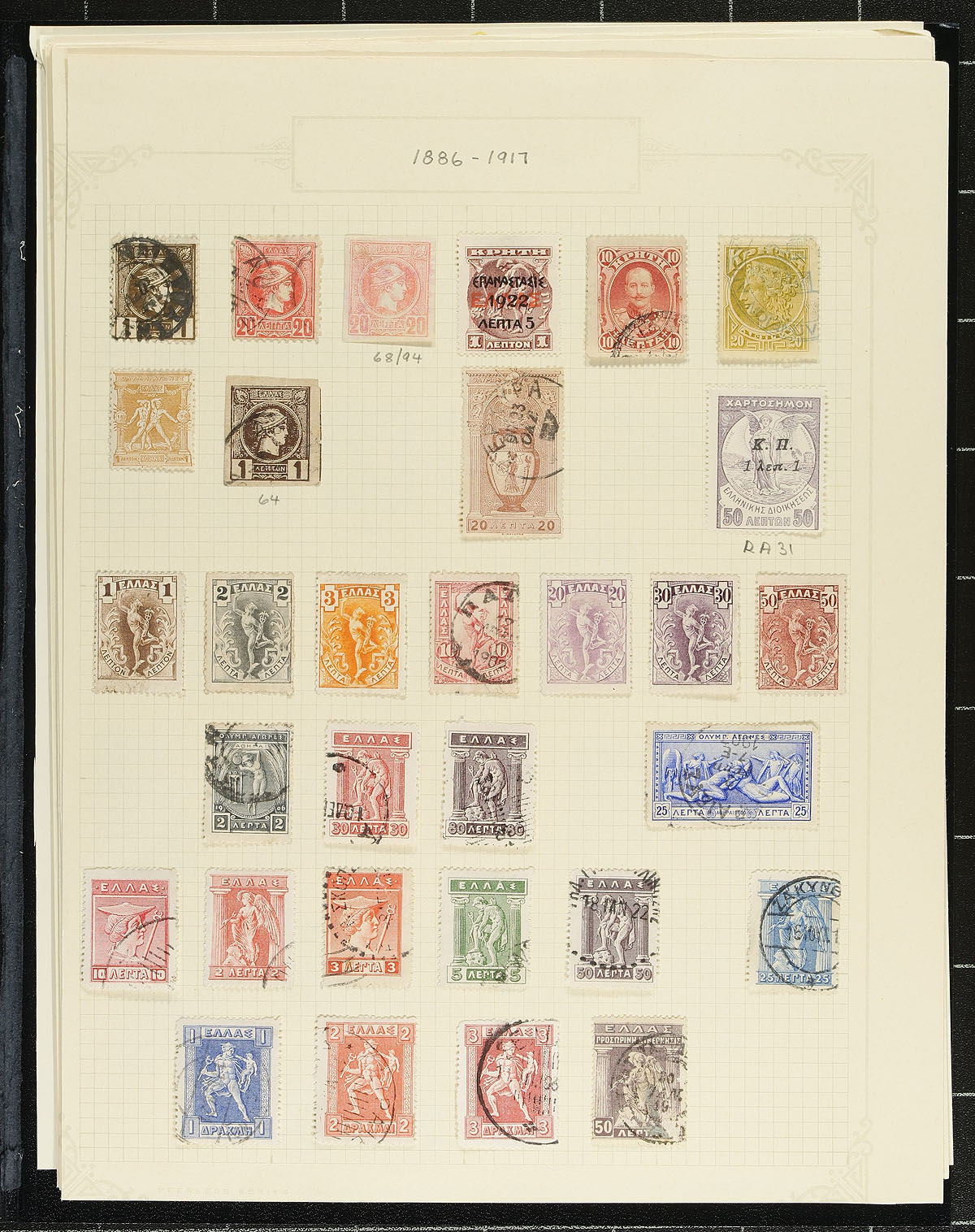 Accumulation of mint and used Greece, 1889-1999, containing over 1,000 stamps in mostly several album or stock pages. The lot is an accumulation of material that generally ranges from Scott #90a/1932, primarily containing used singles, sets, and partial sets. A cursory spot check of material did note some better items including Scott #574-581 (mh, c.v. $115 total), along with sets cataloguing in the $3 to $5 range. Only a portion of the lot has been catalogued by the owner, using a 2005 Scott cataloguing totaling US$523.00, leaving better finds to the dedicated collector. Some of the pages range from very sparsely filled to full pages of stamps. A nice lot for the worldwide collector, overall fine to very fine. Estimate =
