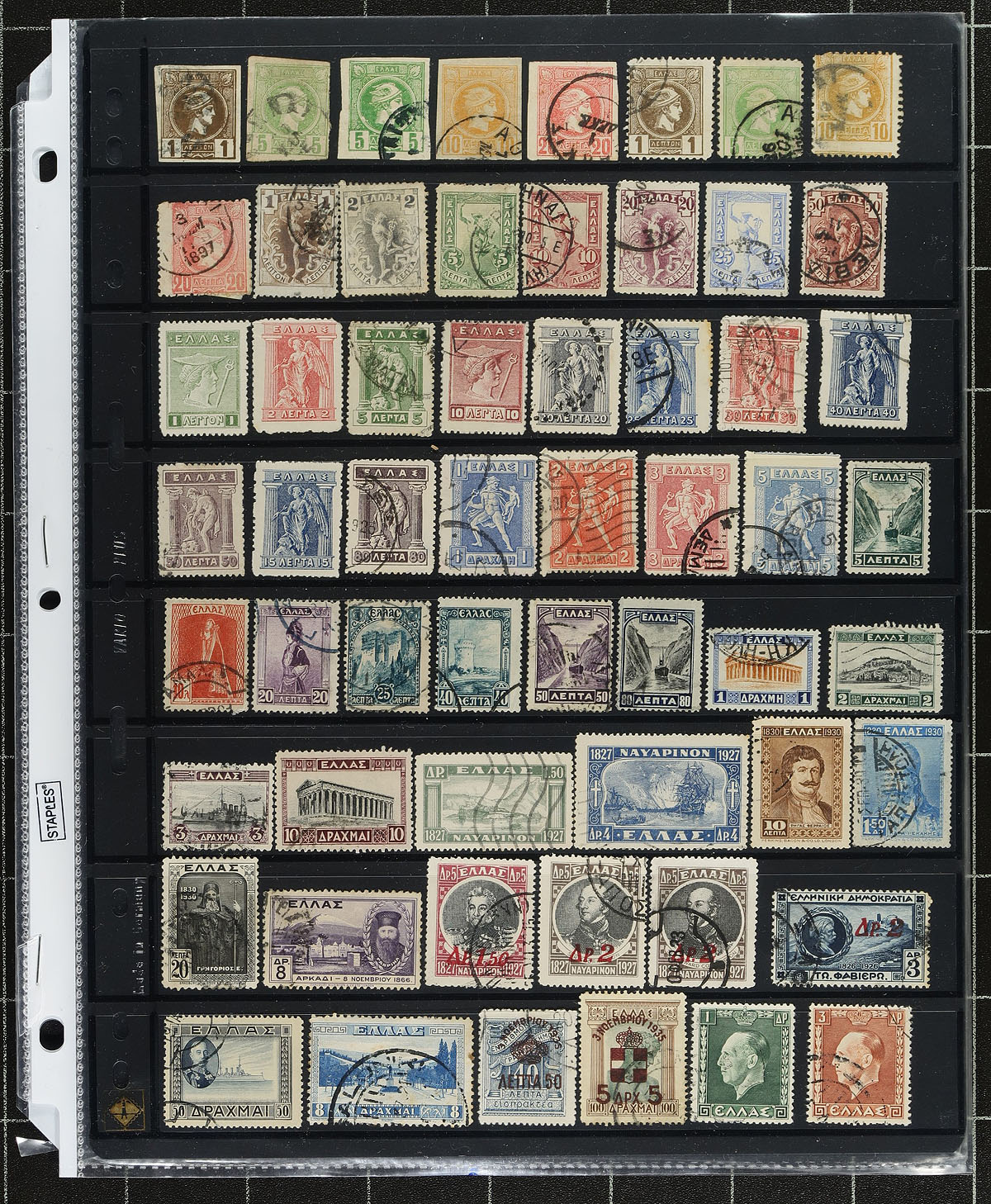 Accumulation of mint and used Greece, 1889-1999, containing over 1,000 stamps in mostly several album or stock pages. The lot is an accumulation of material that generally ranges from Scott #90a/1932, primarily containing used singles, sets, and partial sets. A cursory spot check of material did note some better items including Scott #574-581 (mh, c.v. $115 total), along with sets cataloguing in the $3 to $5 range. Only a portion of the lot has been catalogued by the owner, using a 2005 Scott cataloguing totaling US$523.00, leaving better finds to the dedicated collector. Some of the pages range from very sparsely filled to full pages of stamps. A nice lot for the worldwide collector, overall fine to very fine. Estimate =