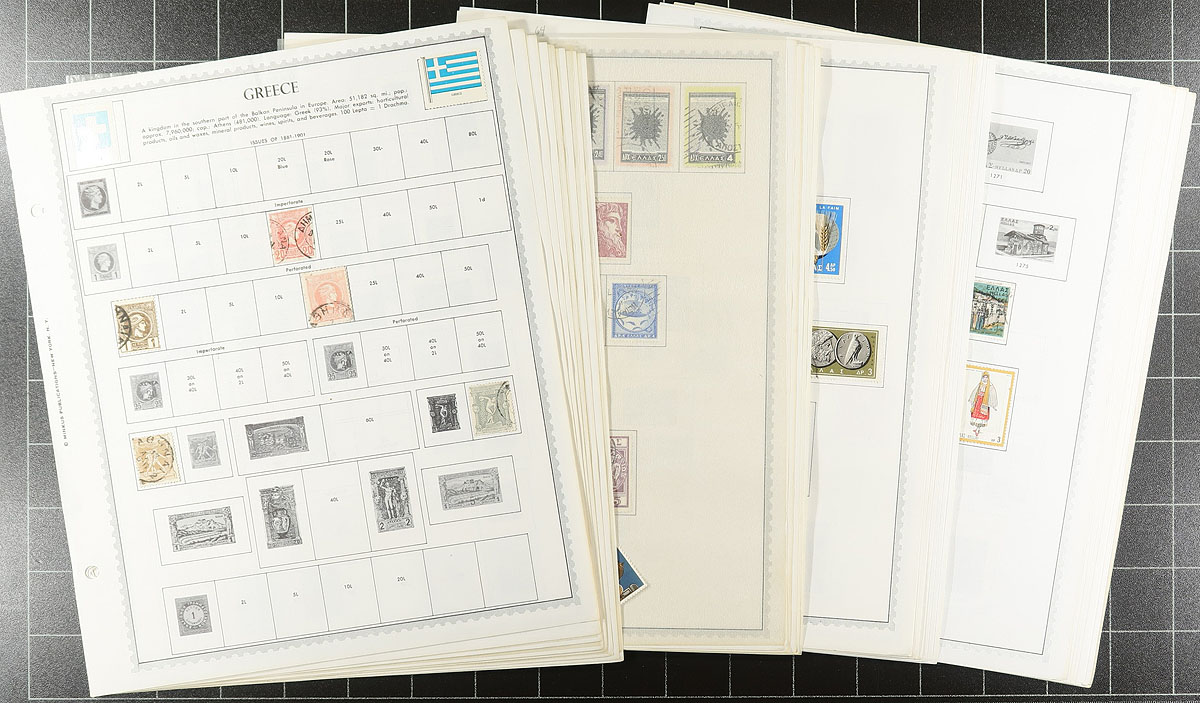 Accumulation of mint and used Greece, 1889-1999, containing over 1,000 stamps in mostly several album or stock pages. The lot is an accumulation of material that generally ranges from Scott #90a/1932, primarily containing used singles, sets, and partial sets. A cursory spot check of material did note some better items including Scott #574-581 (mh, c.v. $115 total), along with sets cataloguing in the $3 to $5 range. Only a portion of the lot has been catalogued by the owner, using a 2005 Scott cataloguing totaling US$523.00, leaving better finds to the dedicated collector. Some of the pages range from very sparsely filled to full pages of stamps. A nice lot for the worldwide collector, overall fine to very fine. Estimate =