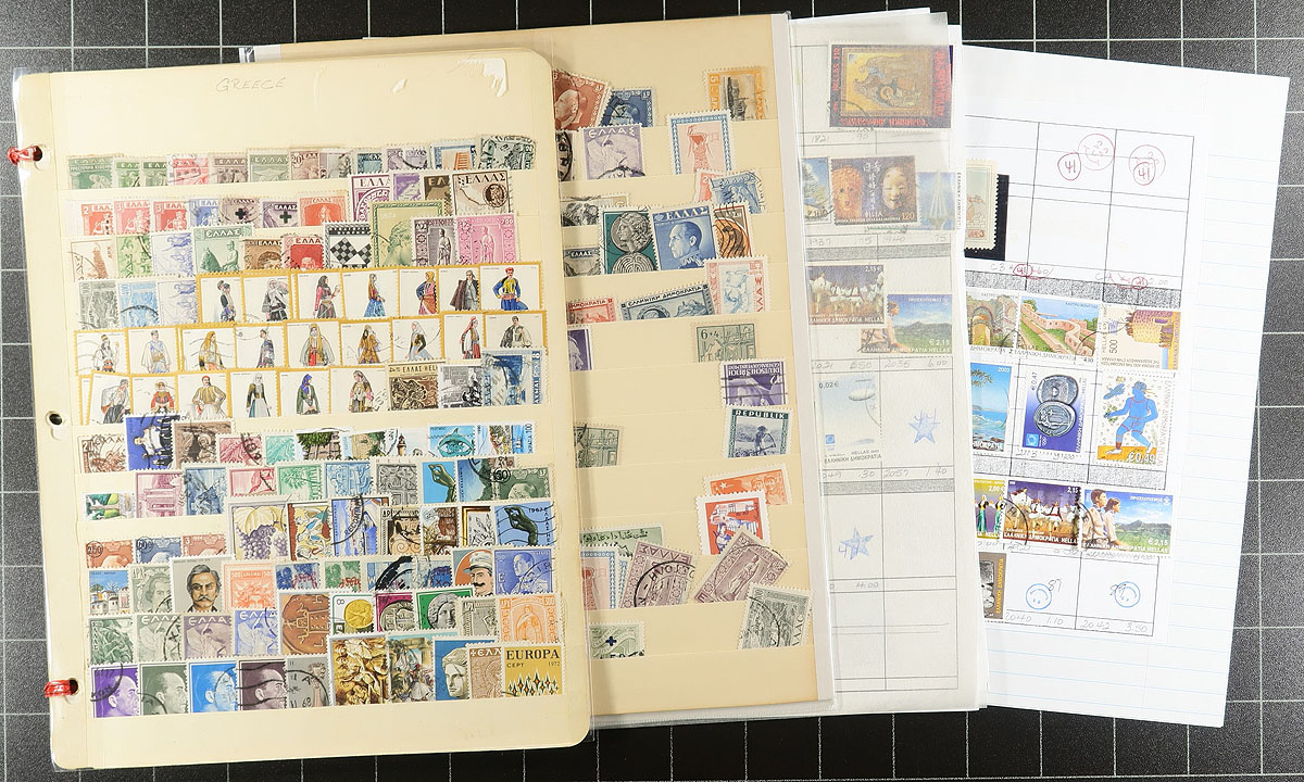 Accumulation of mint and used Greece, 1889-1999, containing over 1,000 stamps in mostly several album or stock pages. The lot is an accumulation of material that generally ranges from Scott #90a/1932, primarily containing used singles, sets, and partial sets. A cursory spot check of material did note some better items including Scott #574-581 (mh, c.v. $115 total), along with sets cataloguing in the $3 to $5 range. Only a portion of the lot has been catalogued by the owner, using a 2005 Scott cataloguing totaling US$523.00, leaving better finds to the dedicated collector. Some of the pages range from very sparsely filled to full pages of stamps. A nice lot for the worldwide collector, overall fine to very fine. Estimate =