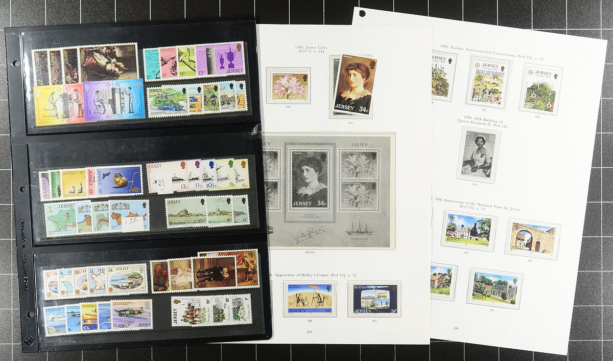 Accumulation of primarily never hinged Jersey, 1959-1997, containing roughly 1,200 stamps in a variety of formats including several album or stock pages, glassines, presentation packs, etc. This fairly well organized lot generally ranges from Scott #1/778, including several sets, blocks and plate blocks, 17 presentation packs (from the 1970's-1980's), and "back of the book" items. A spot check indicated some sets and blocks catalogue $10 and up, with the owner's 2005 Scott catalogue value totaling US$619.00. Almost all of the stamps on album pages are in hingeless mounts, with most of the material never hinged. A nice accumulation for collectors and dealers alike. Estimate =
