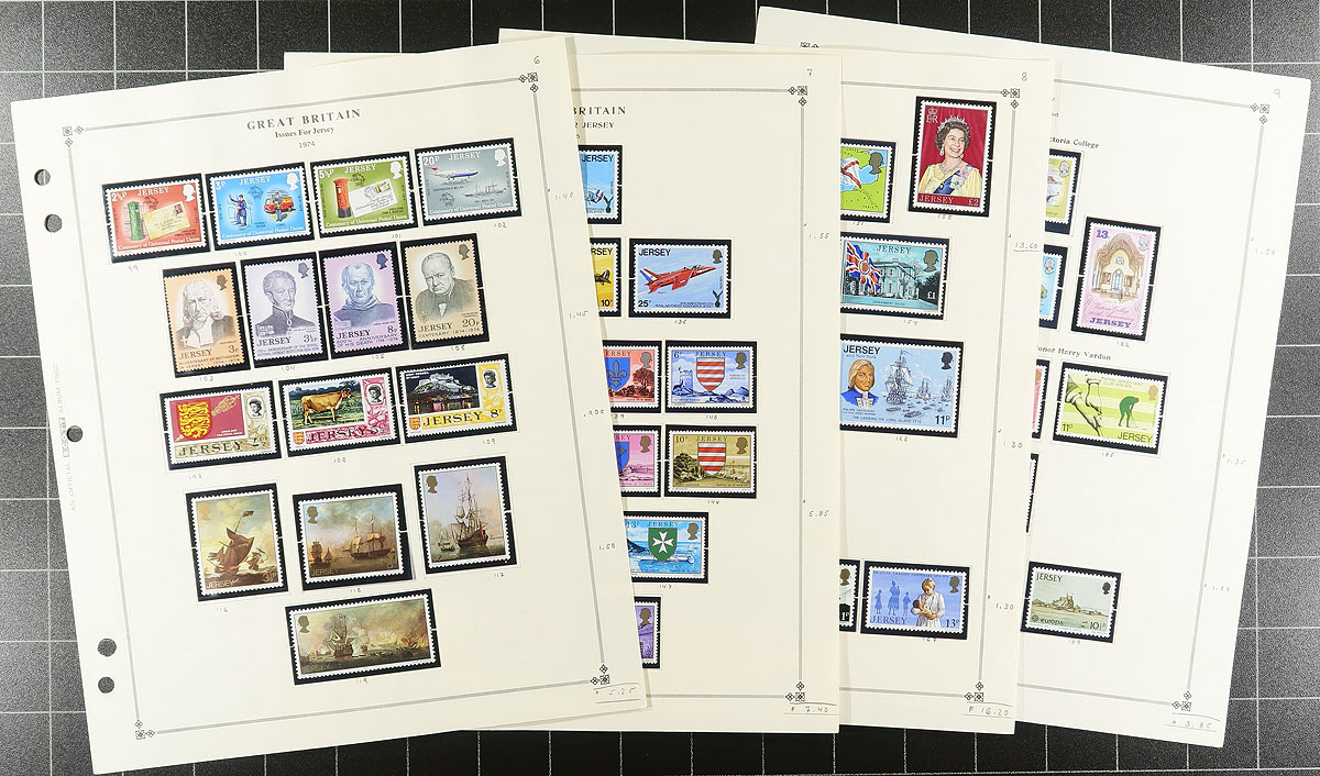 Accumulation of primarily never hinged Jersey, 1959-1997, containing roughly 1,200 stamps in a variety of formats including several album or stock pages, glassines, presentation packs, etc. This fairly well organized lot generally ranges from Scott #1/778, including several sets, blocks and plate blocks, 17 presentation packs (from the 1970's-1980's), and "back of the book" items. A spot check indicated some sets and blocks catalogue $10 and up, with the owner's 2005 Scott catalogue value totaling US$619.00. Almost all of the stamps on album pages are in hingeless mounts, with most of the material never hinged. A nice accumulation for collectors and dealers alike. Estimate =