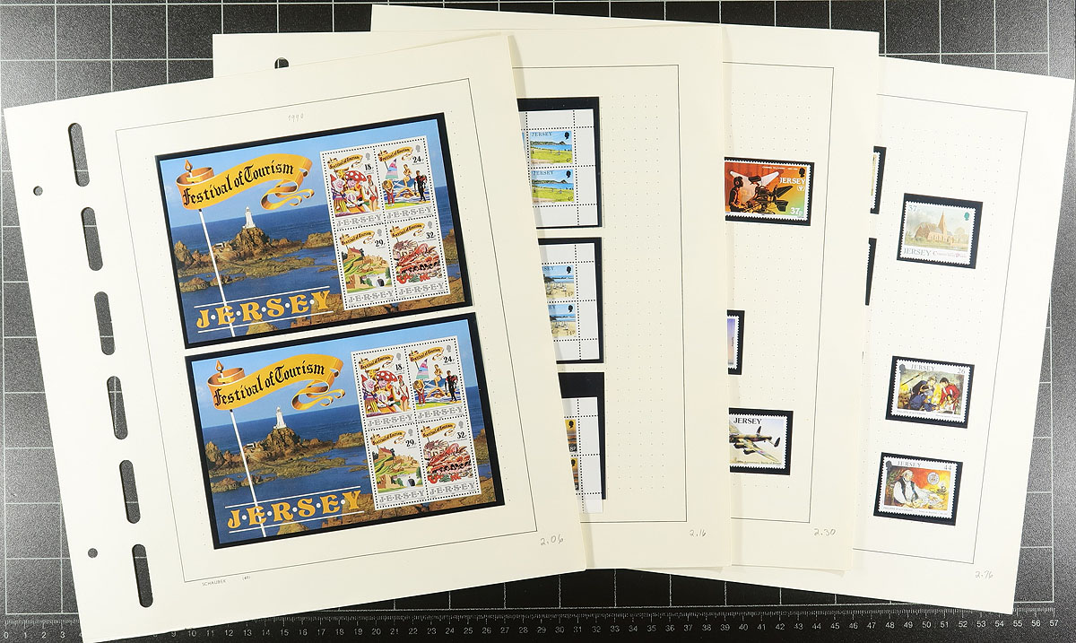 Accumulation of primarily never hinged Jersey, 1959-1997, containing roughly 1,200 stamps in a variety of formats including several album or stock pages, glassines, presentation packs, etc. This fairly well organized lot generally ranges from Scott #1/778, including several sets, blocks and plate blocks, 17 presentation packs (from the 1970's-1980's), and "back of the book" items. A spot check indicated some sets and blocks catalogue $10 and up, with the owner's 2005 Scott catalogue value totaling US$619.00. Almost all of the stamps on album pages are in hingeless mounts, with most of the material never hinged. A nice accumulation for collectors and dealers alike. Estimate =