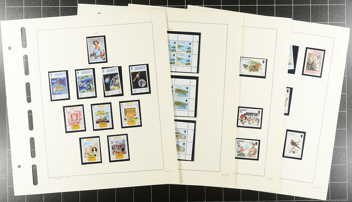 Accumulation of primarily never hinged Jersey, 1959-1997, containing roughly 1,200 stamps in a variety of formats including several album or stock pages, glassines, presentation packs, etc. This fairly well organized lot generally ranges from Scott #1/778, including several sets, blocks and plate blocks, 17 presentation packs (from the 1970's-1980's), and "back of the book" items. A spot check indicated some sets and blocks catalogue $10 and up, with the owner's 2005 Scott catalogue value totaling US$619.00. Almost all of the stamps on album pages are in hingeless mounts, with most of the material never hinged. A nice accumulation for collectors and dealers alike. Estimate =