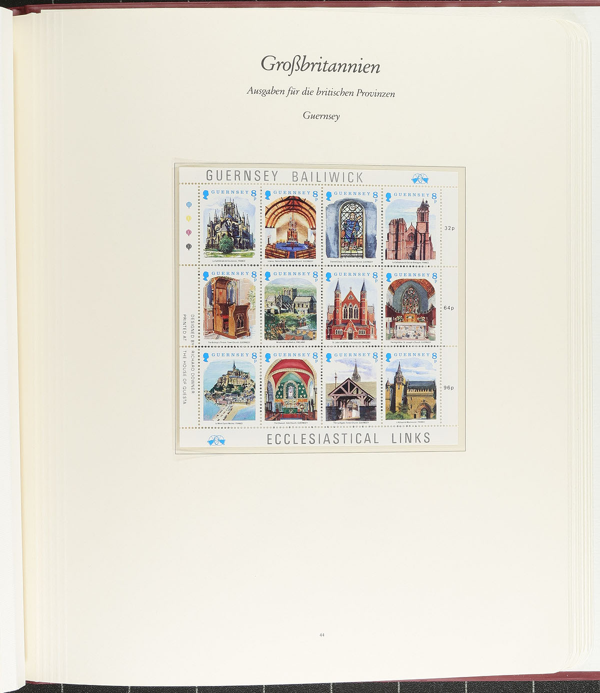 Collection of never hinged Guernsey, 1979-2014, containing many hundreds of stamps in 2 albums. The collection generally ranges from Scott #173/1280, containing primarily sets, several souvenir sheets and sheetlets. The first Borek album contains roughly 450 stamps in hingeless mounts ranging from 1979 to 1990, including 20 full panes, and a few booklet panes and souvenir sheets. The second Lighthouse album with slipcase, contains a few hundred stamps, along with souvenir sheets, in hingeless mounts ranging from 2006 to 2014. We note some items cataloguing $5 to $10 and up, with the owner's 2018 Scott catalogue value totaling US$863.00. A clean lot for collectors and dealers alike. Estimate =