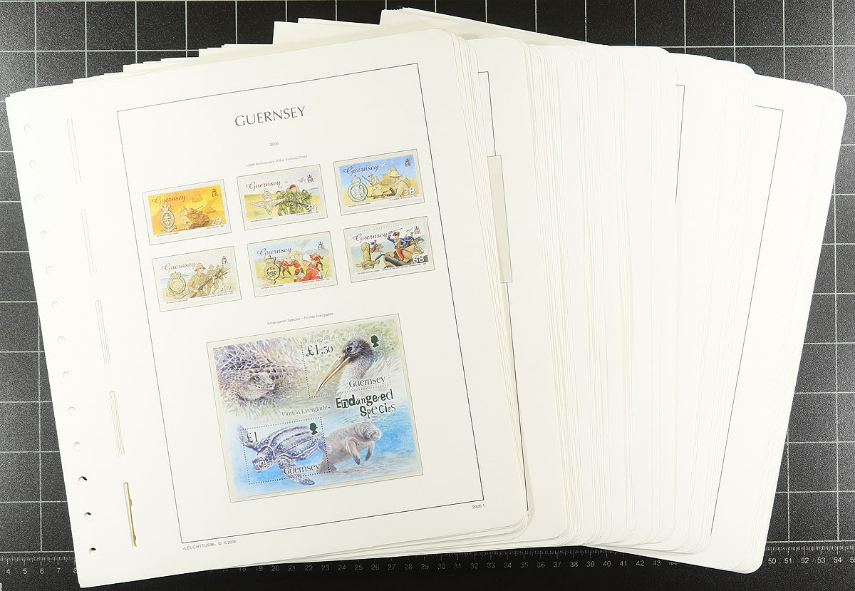 Collection of never hinged Guernsey, 1979-2014, containing many hundreds of stamps in 2 albums. The collection generally ranges from Scott #173/1280, containing primarily sets, several souvenir sheets and sheetlets. The first Borek album contains roughly 450 stamps in hingeless mounts ranging from 1979 to 1990, including 20 full panes, and a few booklet panes and souvenir sheets. The second Lighthouse album with slipcase, contains a few hundred stamps, along with souvenir sheets, in hingeless mounts ranging from 2006 to 2014. We note some items cataloguing $5 to $10 and up, with the owner's 2018 Scott catalogue value totaling US$863.00. A clean lot for collectors and dealers alike. Estimate =