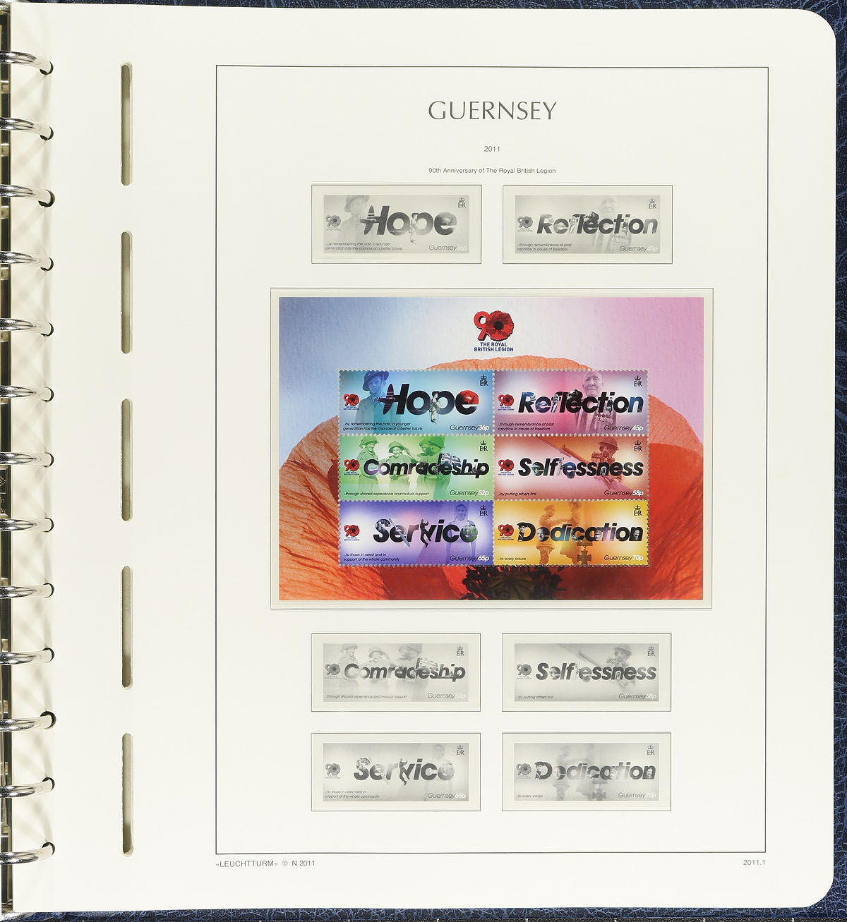 Collection of never hinged Guernsey, 1979-2014, containing many hundreds of stamps in 2 albums. The collection generally ranges from Scott #173/1280, containing primarily sets, several souvenir sheets and sheetlets. The first Borek album contains roughly 450 stamps in hingeless mounts ranging from 1979 to 1990, including 20 full panes, and a few booklet panes and souvenir sheets. The second Lighthouse album with slipcase, contains a few hundred stamps, along with souvenir sheets, in hingeless mounts ranging from 2006 to 2014. We note some items cataloguing $5 to $10 and up, with the owner's 2018 Scott catalogue value totaling US$863.00. A clean lot for collectors and dealers alike. Estimate =