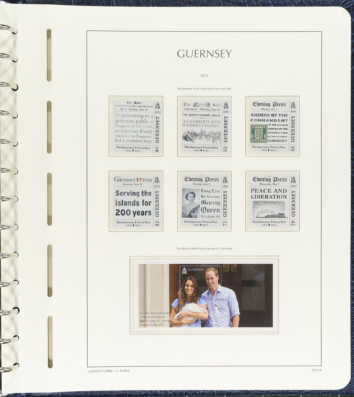 Collection of never hinged Guernsey, 1979-2014, containing many hundreds of stamps in 2 albums. The collection generally ranges from Scott #173/1280, containing primarily sets, several souvenir sheets and sheetlets. The first Borek album contains roughly 450 stamps in hingeless mounts ranging from 1979 to 1990, including 20 full panes, and a few booklet panes and souvenir sheets. The second Lighthouse album with slipcase, contains a few hundred stamps, along with souvenir sheets, in hingeless mounts ranging from 2006 to 2014. We note some items cataloguing $5 to $10 and up, with the owner's 2018 Scott catalogue value totaling US$863.00. A clean lot for collectors and dealers alike. Estimate =