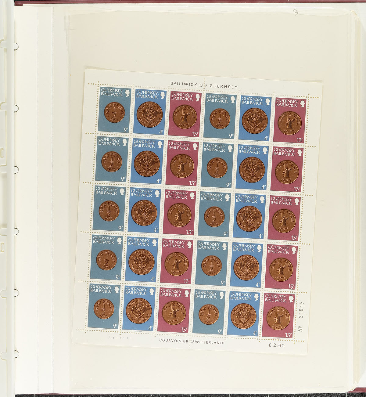 Collection of never hinged Guernsey, 1979-2014, containing many hundreds of stamps in 2 albums. The collection generally ranges from Scott #173/1280, containing primarily sets, several souvenir sheets and sheetlets. The first Borek album contains roughly 450 stamps in hingeless mounts ranging from 1979 to 1990, including 20 full panes, and a few booklet panes and souvenir sheets. The second Lighthouse album with slipcase, contains a few hundred stamps, along with souvenir sheets, in hingeless mounts ranging from 2006 to 2014. We note some items cataloguing $5 to $10 and up, with the owner's 2018 Scott catalogue value totaling US$863.00. A clean lot for collectors and dealers alike. Estimate =