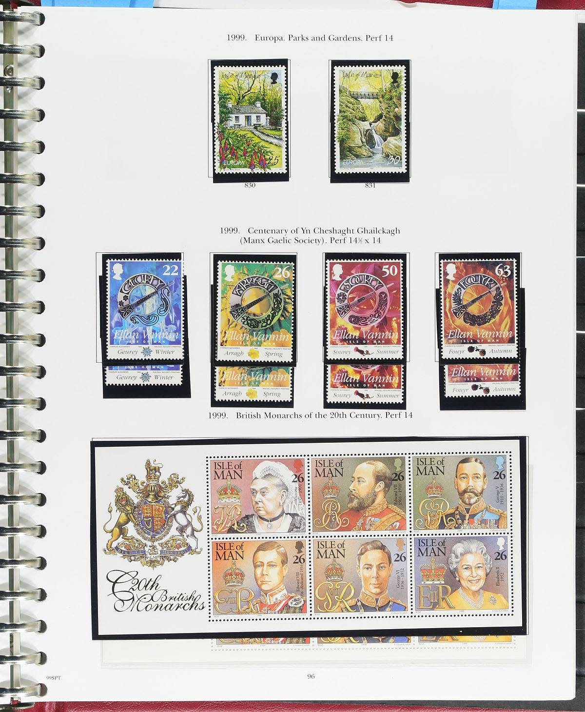 Nice collection of primarily never hinged Isle of Man, 1973-2001, containing roughly 950 stamps, well organized in mostly hingeless mounts in a thick Stanley Gibbons album. The collection ranges from Scott #12/939 (fairly complete in period), including several souvenir sheets, strips, gutter pairs, and more. A spot check indicates some material cataloguing $5 to $10 and up, with the owner's 2015 Scott catalogue value totaling US$1,285.00. We note mild duplication with some sets, with the vast majority of material being never hinged. A nice lot for collectors and dealers alike. Estimate =