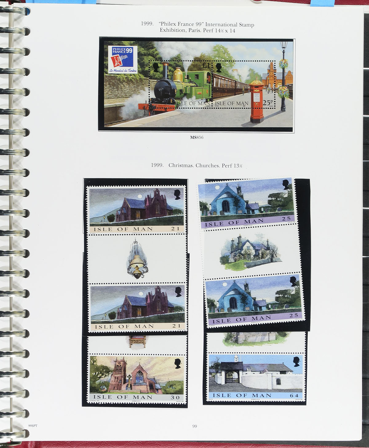 Nice collection of primarily never hinged Isle of Man, 1973-2001, containing roughly 950 stamps, well organized in mostly hingeless mounts in a thick Stanley Gibbons album. The collection ranges from Scott #12/939 (fairly complete in period), including several souvenir sheets, strips, gutter pairs, and more. A spot check indicates some material cataloguing $5 to $10 and up, with the owner's 2015 Scott catalogue value totaling US$1,285.00. We note mild duplication with some sets, with the vast majority of material being never hinged. A nice lot for collectors and dealers alike. Estimate =