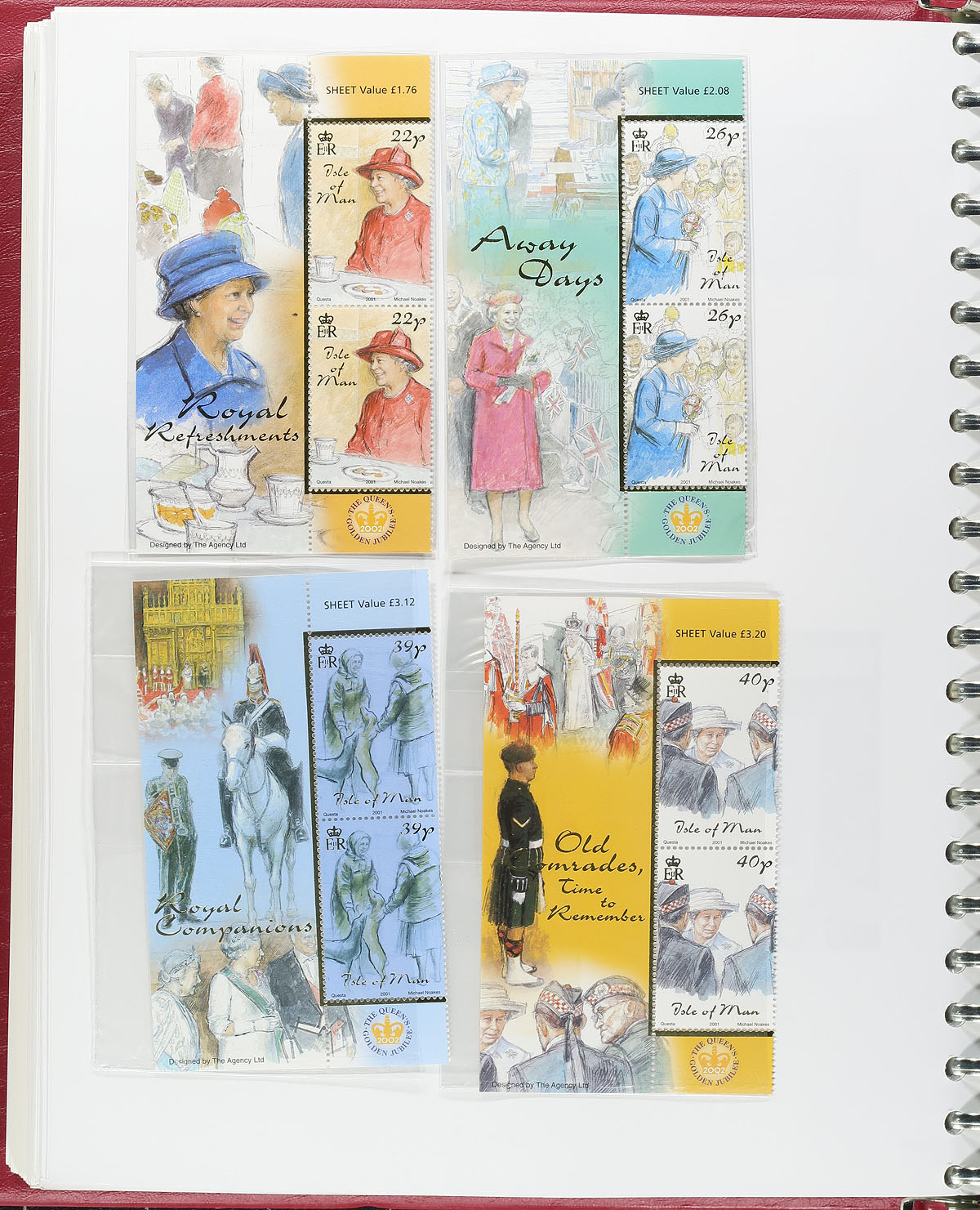 Nice collection of primarily never hinged Isle of Man, 1973-2001, containing roughly 950 stamps, well organized in mostly hingeless mounts in a thick Stanley Gibbons album. The collection ranges from Scott #12/939 (fairly complete in period), including several souvenir sheets, strips, gutter pairs, and more. A spot check indicates some material cataloguing $5 to $10 and up, with the owner's 2015 Scott catalogue value totaling US$1,285.00. We note mild duplication with some sets, with the vast majority of material being never hinged. A nice lot for collectors and dealers alike. Estimate =