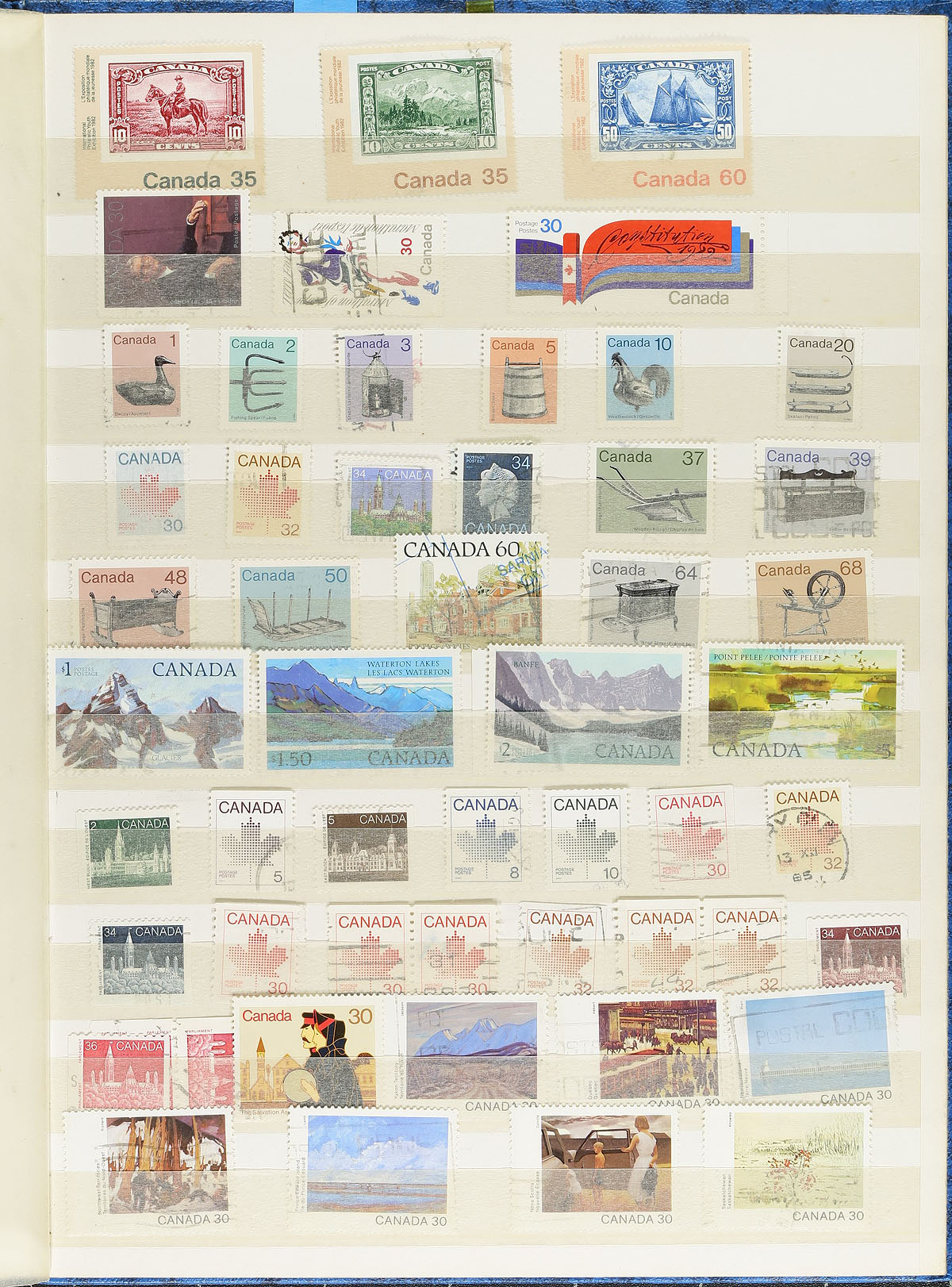 Collection of used Canada, 1859-1991, containing over 1,000 stamps in 2 stockbooks. The collection ranges from Scott #14/1342, including sets and a small selection of back of the book issues noting early issues with #s 14, 17, Large Queens 26-27, 29-30, 12 Small Queens (including 10c, 20c and 50c Widow Weeds), a few Jubilees up to the 8c, with partial sets of Leafs, Numerals, Edwards, and Quebecs. The collection continues with full sets of Admiral, Scroll, Arch, both Pictorials, up to the Peace issue. Postmark interest includes cds and a few other types, noting a number of 'socked on the nose' town cancels. A nice collection that should be continued, a few faults with a few of the early issues, overall fine to very fine. Estimate =
