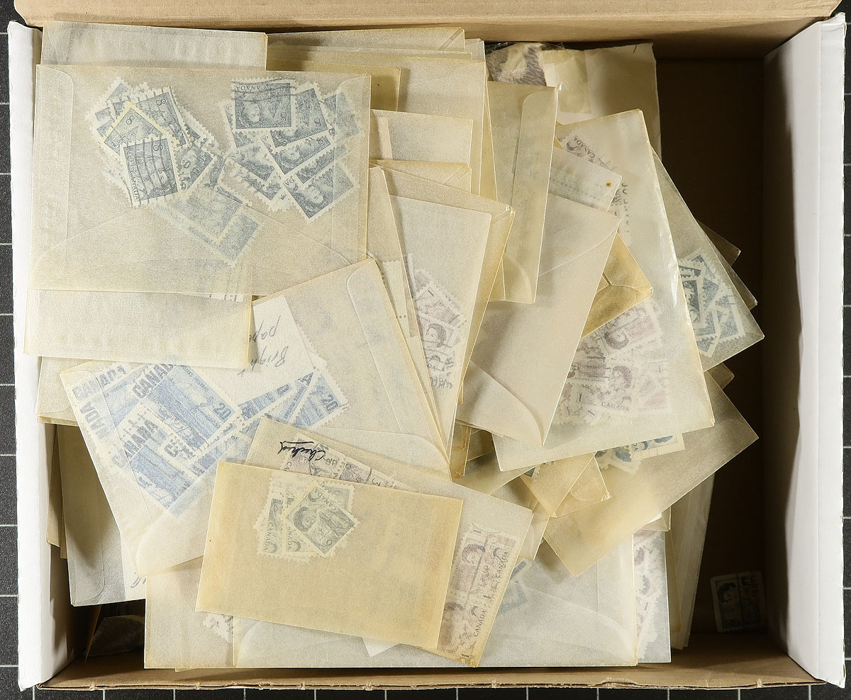 Large accumulation of used Centennial issues, with well over 10,000 low denomination stamps (1c-8c), on and off paper in a few formats. The lot includes roughly 8,000 stamps in bundles of 100 each, neatly organized in a small box, along with several glassines organized by denomination, plus a box of a few thousand on paper stamps, along with a few covers to round out the lot. Completely unchecked by us for the host of possible papers, varieties, taggings and other aspects these issues are known for. A nice winter project for the specialist. Overall fine to very fine. Estimate =