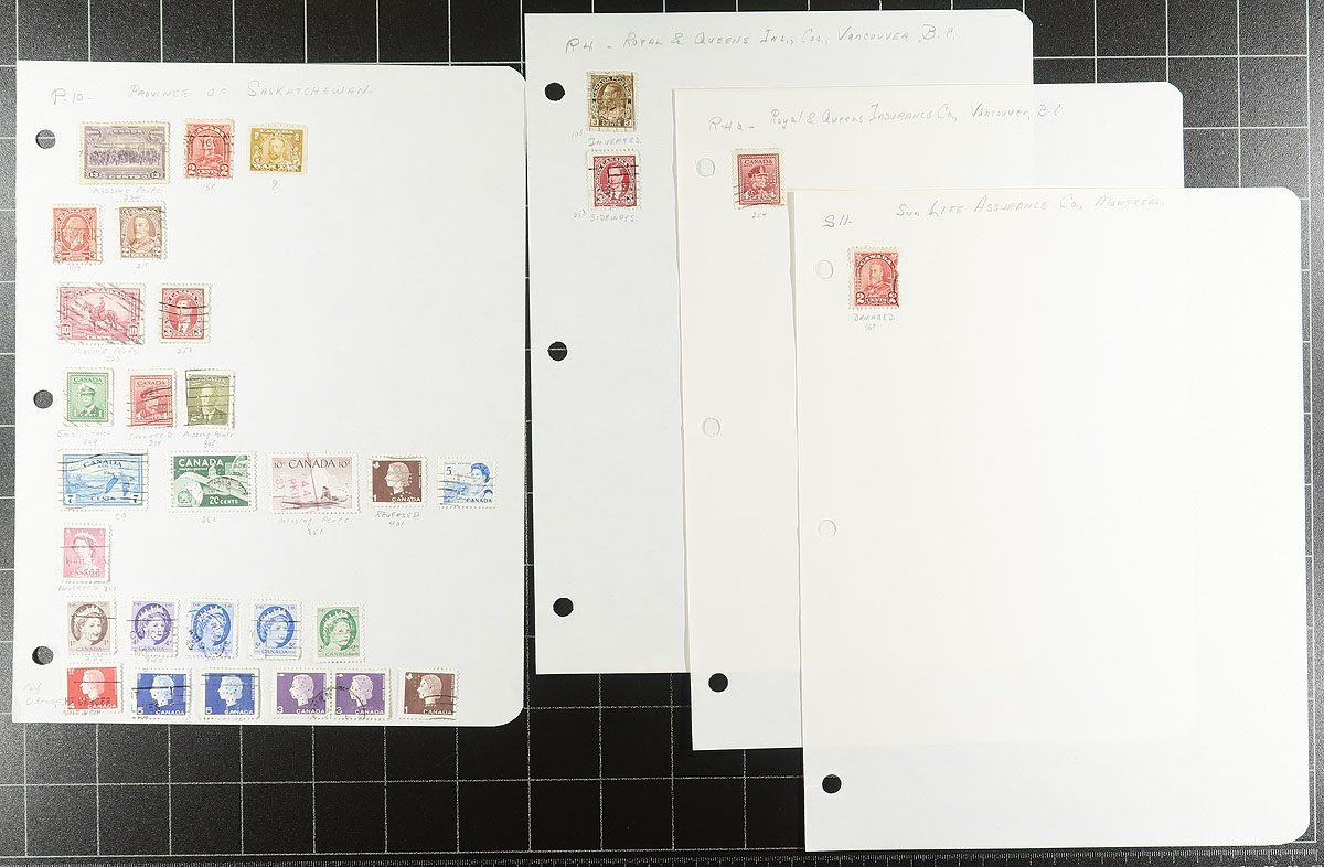 Private Perfins. Specialized collection of roughly 300 stamps, neatly organized on homemade pages, with material generally ranging from the 1920s to the 1950s. The collection is organized by the roughly 25 different companies or government agencies, with each stamp meticulously identified by the owner including inverted patterns, double punched, towns, types, etc. A very nice lot of this popular collecting area, with each page photographed online. Estimate =