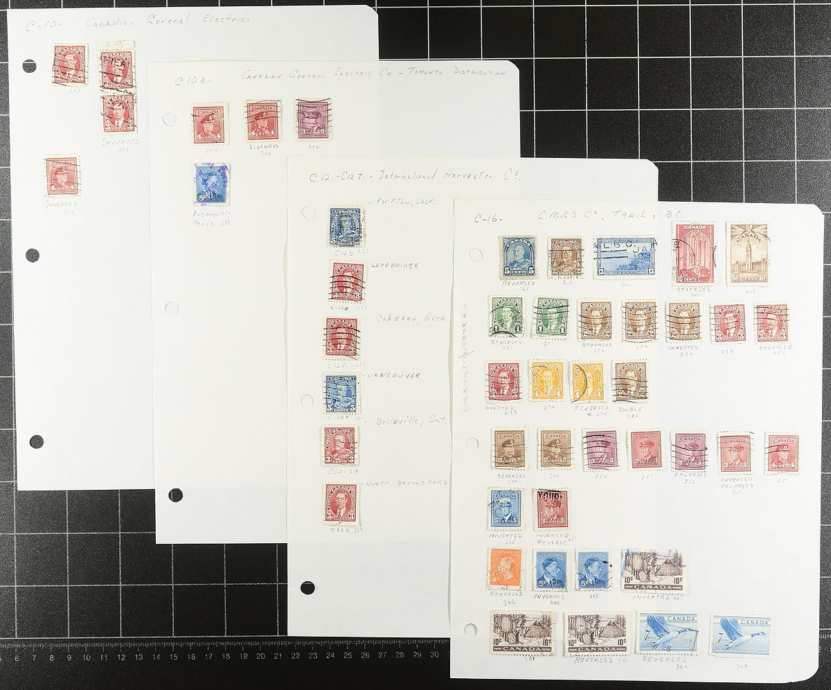 Private Perfins. Specialized collection of roughly 300 stamps, neatly organized on homemade pages, with material generally ranging from the 1920s to the 1950s. The collection is organized by the roughly 25 different companies or government agencies, with each stamp meticulously identified by the owner including inverted patterns, double punched, towns, types, etc. A very nice lot of this popular collecting area, with each page photographed online. Estimate =