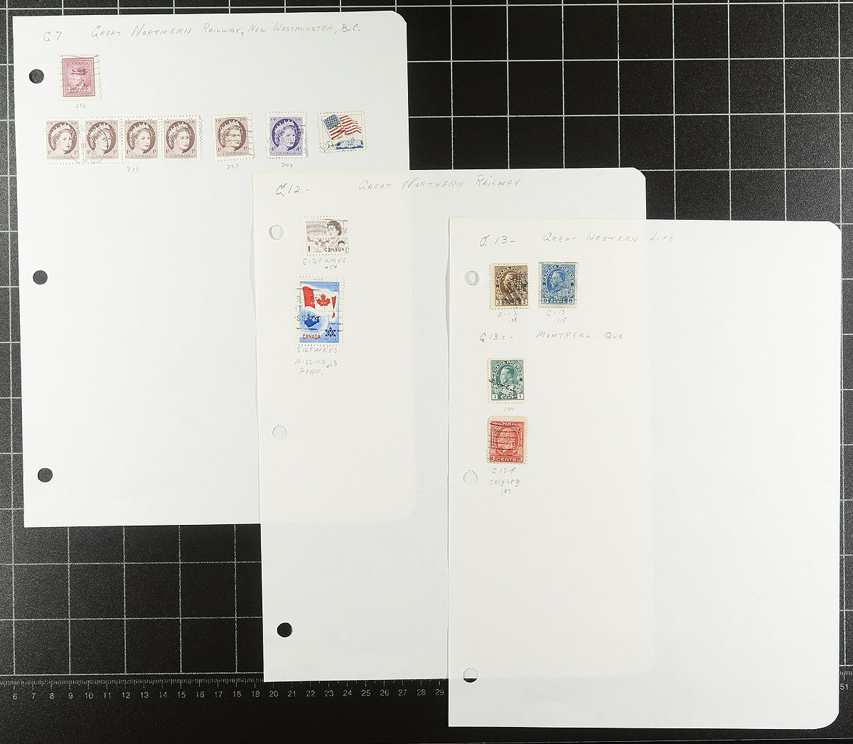 Private Perfins. Specialized collection of roughly 300 stamps, neatly organized on homemade pages, with material generally ranging from the 1920s to the 1950s. The collection is organized by the roughly 25 different companies or government agencies, with each stamp meticulously identified by the owner including inverted patterns, double punched, towns, types, etc. A very nice lot of this popular collecting area, with each page photographed online. Estimate =