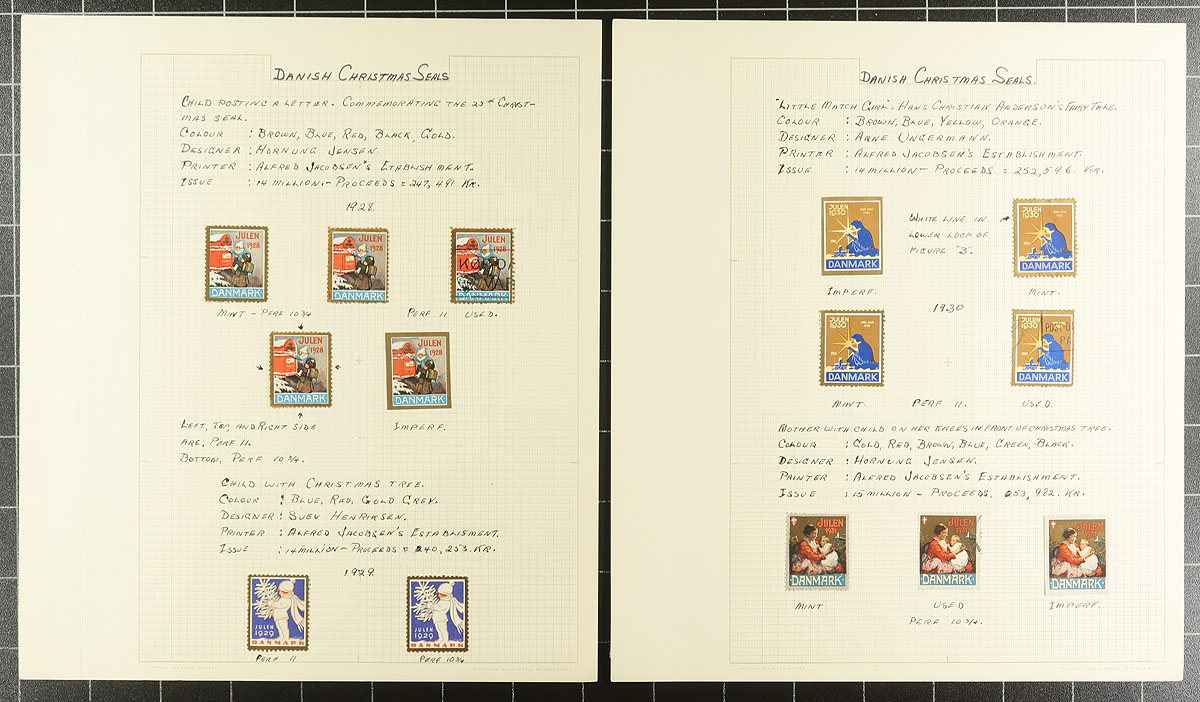 Christmas Seals. Wonderful collection of mint and used Denmark Christmas seals, 1904-1970, containing several hundred seals neatly organized on homemade pages in a springback album. This well developed collection contains a mint and a used seal for each year, along with a mint imperforate stamp and mint blocks for some years, and complete panes from 1952-1970 (including an imperforate sheet for a few years). The collection includes the owner's notations that identified errors, perforations and background information for each issue. A wonderful collection noting items that retail $10 to $30 each, including a 1905 seal on a postal card, ideal for the Christmas Seal, or thematic / topical collector, and should be continued to the present day. Overall fine to very fine. Estimate =