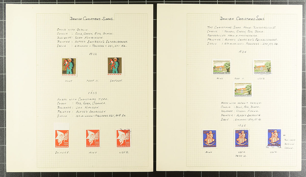 Christmas Seals. Wonderful collection of mint and used Denmark Christmas seals, 1904-1970, containing several hundred seals neatly organized on homemade pages in a springback album. This well developed collection contains a mint and a used seal for each year, along with a mint imperforate stamp and mint blocks for some years, and complete panes from 1952-1970 (including an imperforate sheet for a few years). The collection includes the owner's notations that identified errors, perforations and background information for each issue. A wonderful collection noting items that retail $10 to $30 each, including a 1905 seal on a postal card, ideal for the Christmas Seal, or thematic / topical collector, and should be continued to the present day. Overall fine to very fine. Estimate =