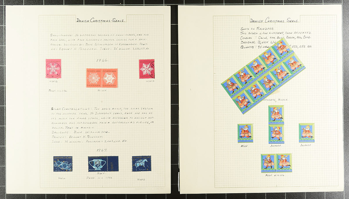 Christmas Seals. Wonderful collection of mint and used Denmark Christmas seals, 1904-1970, containing several hundred seals neatly organized on homemade pages in a springback album. This well developed collection contains a mint and a used seal for each year, along with a mint imperforate stamp and mint blocks for some years, and complete panes from 1952-1970 (including an imperforate sheet for a few years). The collection includes the owner's notations that identified errors, perforations and background information for each issue. A wonderful collection noting items that retail $10 to $30 each, including a 1905 seal on a postal card, ideal for the Christmas Seal, or thematic / topical collector, and should be continued to the present day. Overall fine to very fine. Estimate =