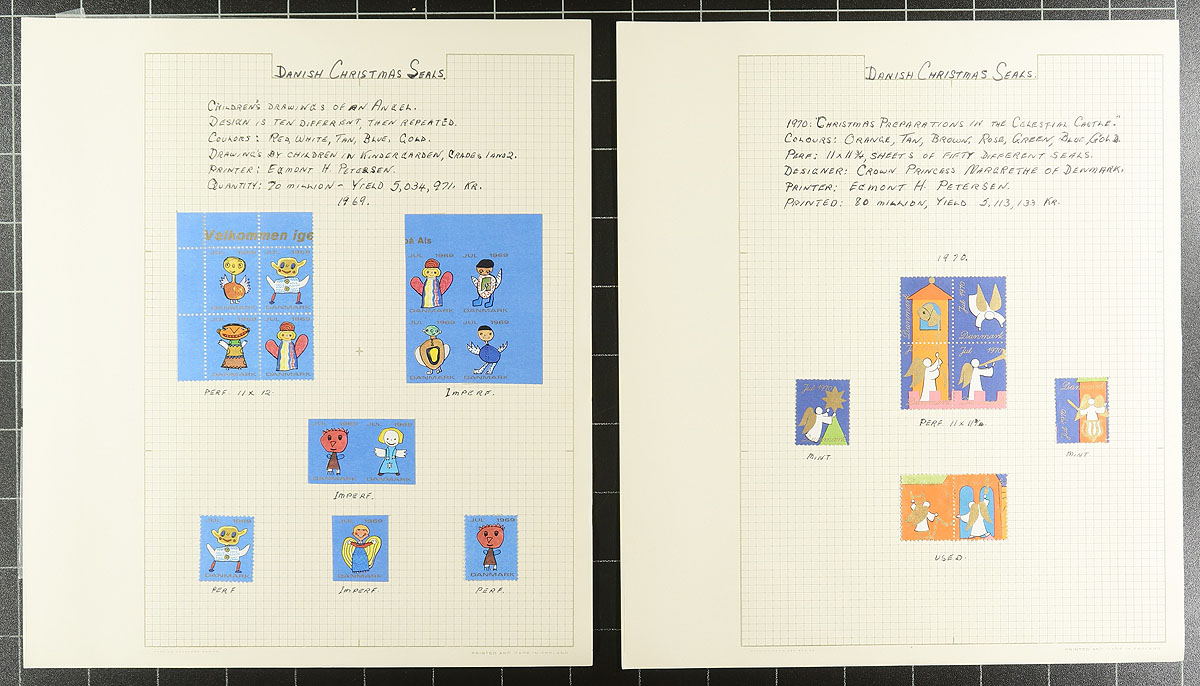 Christmas Seals. Wonderful collection of mint and used Denmark Christmas seals, 1904-1970, containing several hundred seals neatly organized on homemade pages in a springback album. This well developed collection contains a mint and a used seal for each year, along with a mint imperforate stamp and mint blocks for some years, and complete panes from 1952-1970 (including an imperforate sheet for a few years). The collection includes the owner's notations that identified errors, perforations and background information for each issue. A wonderful collection noting items that retail $10 to $30 each, including a 1905 seal on a postal card, ideal for the Christmas Seal, or thematic / topical collector, and should be continued to the present day. Overall fine to very fine. Estimate =