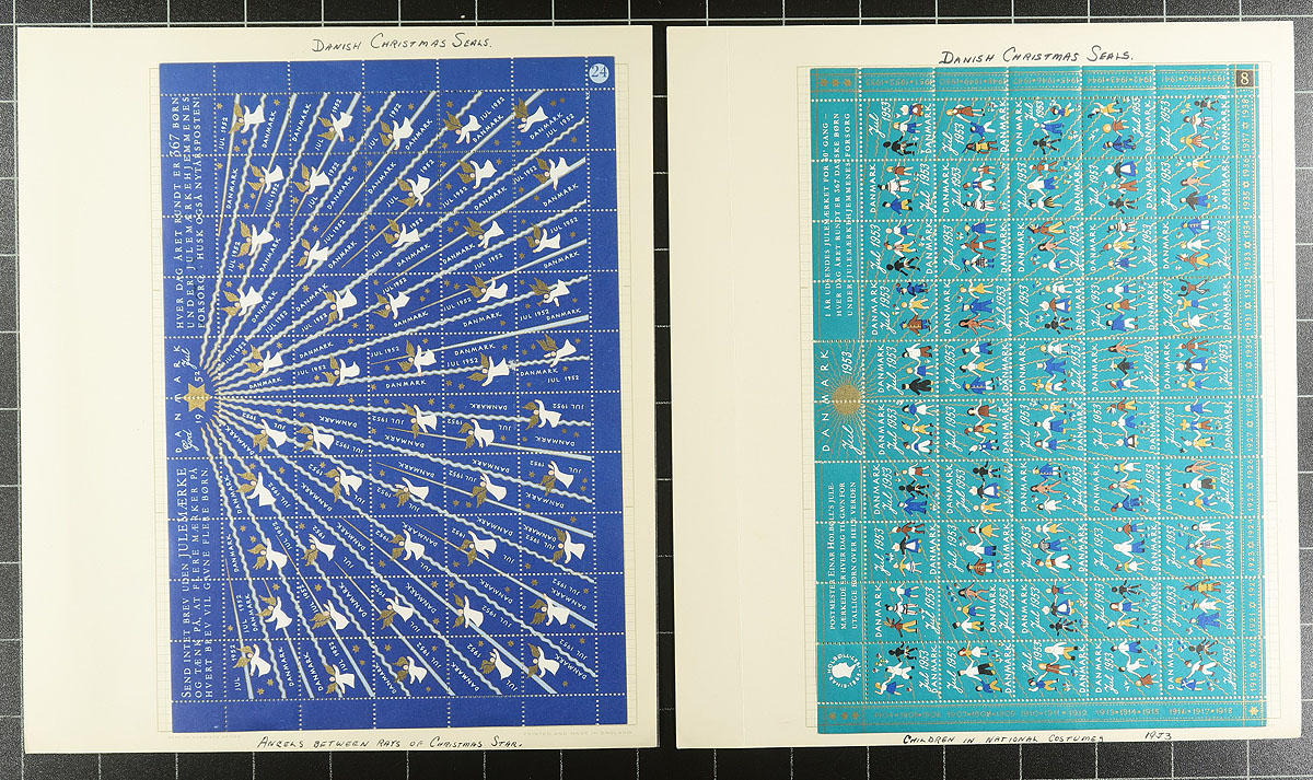 Christmas Seals. Wonderful collection of mint and used Denmark Christmas seals, 1904-1970, containing several hundred seals neatly organized on homemade pages in a springback album. This well developed collection contains a mint and a used seal for each year, along with a mint imperforate stamp and mint blocks for some years, and complete panes from 1952-1970 (including an imperforate sheet for a few years). The collection includes the owner's notations that identified errors, perforations and background information for each issue. A wonderful collection noting items that retail $10 to $30 each, including a 1905 seal on a postal card, ideal for the Christmas Seal, or thematic / topical collector, and should be continued to the present day. Overall fine to very fine. Estimate =