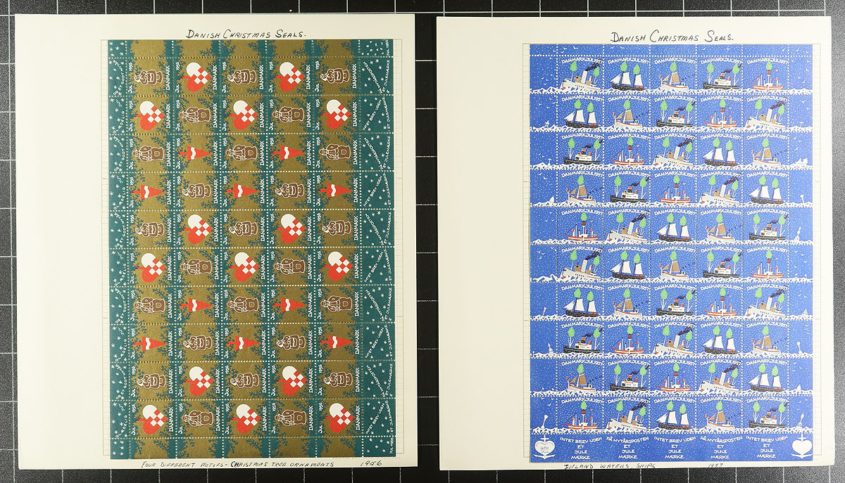 Christmas Seals. Wonderful collection of mint and used Denmark Christmas seals, 1904-1970, containing several hundred seals neatly organized on homemade pages in a springback album. This well developed collection contains a mint and a used seal for each year, along with a mint imperforate stamp and mint blocks for some years, and complete panes from 1952-1970 (including an imperforate sheet for a few years). The collection includes the owner's notations that identified errors, perforations and background information for each issue. A wonderful collection noting items that retail $10 to $30 each, including a 1905 seal on a postal card, ideal for the Christmas Seal, or thematic / topical collector, and should be continued to the present day. Overall fine to very fine. Estimate =