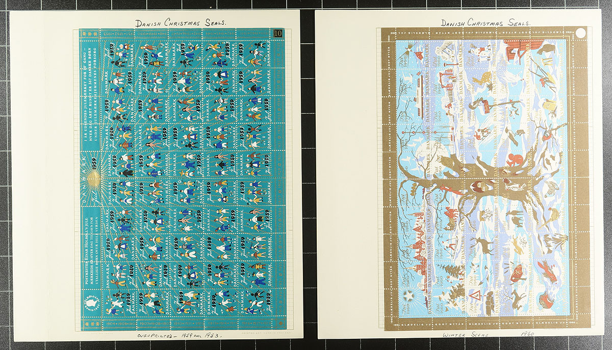 Christmas Seals. Wonderful collection of mint and used Denmark Christmas seals, 1904-1970, containing several hundred seals neatly organized on homemade pages in a springback album. This well developed collection contains a mint and a used seal for each year, along with a mint imperforate stamp and mint blocks for some years, and complete panes from 1952-1970 (including an imperforate sheet for a few years). The collection includes the owner's notations that identified errors, perforations and background information for each issue. A wonderful collection noting items that retail $10 to $30 each, including a 1905 seal on a postal card, ideal for the Christmas Seal, or thematic / topical collector, and should be continued to the present day. Overall fine to very fine. Estimate =