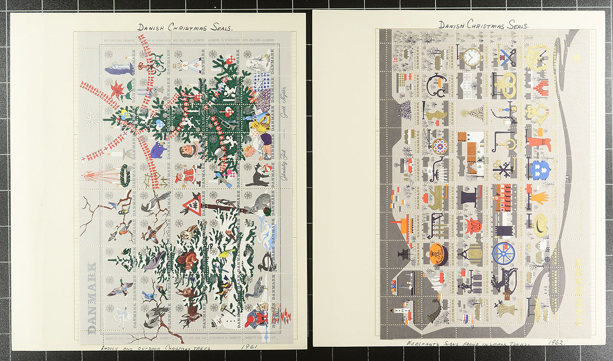 Christmas Seals. Wonderful collection of mint and used Denmark Christmas seals, 1904-1970, containing several hundred seals neatly organized on homemade pages in a springback album. This well developed collection contains a mint and a used seal for each year, along with a mint imperforate stamp and mint blocks for some years, and complete panes from 1952-1970 (including an imperforate sheet for a few years). The collection includes the owner's notations that identified errors, perforations and background information for each issue. A wonderful collection noting items that retail $10 to $30 each, including a 1905 seal on a postal card, ideal for the Christmas Seal, or thematic / topical collector, and should be continued to the present day. Overall fine to very fine. Estimate =