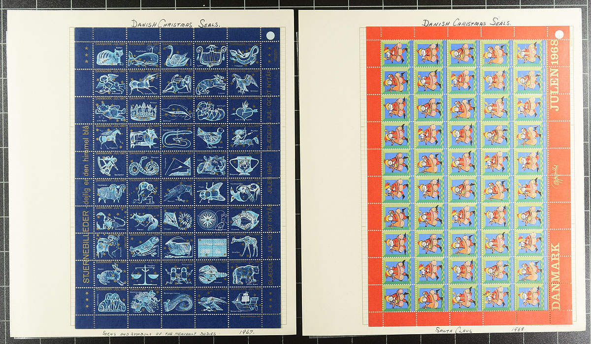 Christmas Seals. Wonderful collection of mint and used Denmark Christmas seals, 1904-1970, containing several hundred seals neatly organized on homemade pages in a springback album. This well developed collection contains a mint and a used seal for each year, along with a mint imperforate stamp and mint blocks for some years, and complete panes from 1952-1970 (including an imperforate sheet for a few years). The collection includes the owner's notations that identified errors, perforations and background information for each issue. A wonderful collection noting items that retail $10 to $30 each, including a 1905 seal on a postal card, ideal for the Christmas Seal, or thematic / topical collector, and should be continued to the present day. Overall fine to very fine. Estimate =