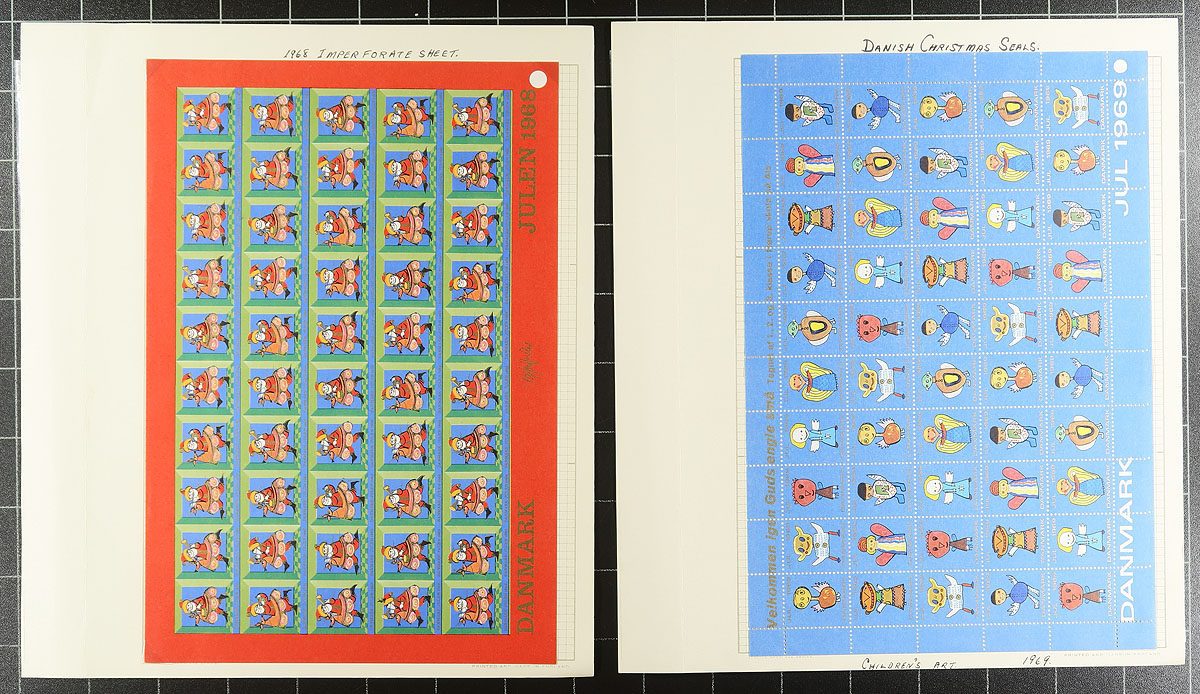 Christmas Seals. Wonderful collection of mint and used Denmark Christmas seals, 1904-1970, containing several hundred seals neatly organized on homemade pages in a springback album. This well developed collection contains a mint and a used seal for each year, along with a mint imperforate stamp and mint blocks for some years, and complete panes from 1952-1970 (including an imperforate sheet for a few years). The collection includes the owner's notations that identified errors, perforations and background information for each issue. A wonderful collection noting items that retail $10 to $30 each, including a 1905 seal on a postal card, ideal for the Christmas Seal, or thematic / topical collector, and should be continued to the present day. Overall fine to very fine. Estimate =