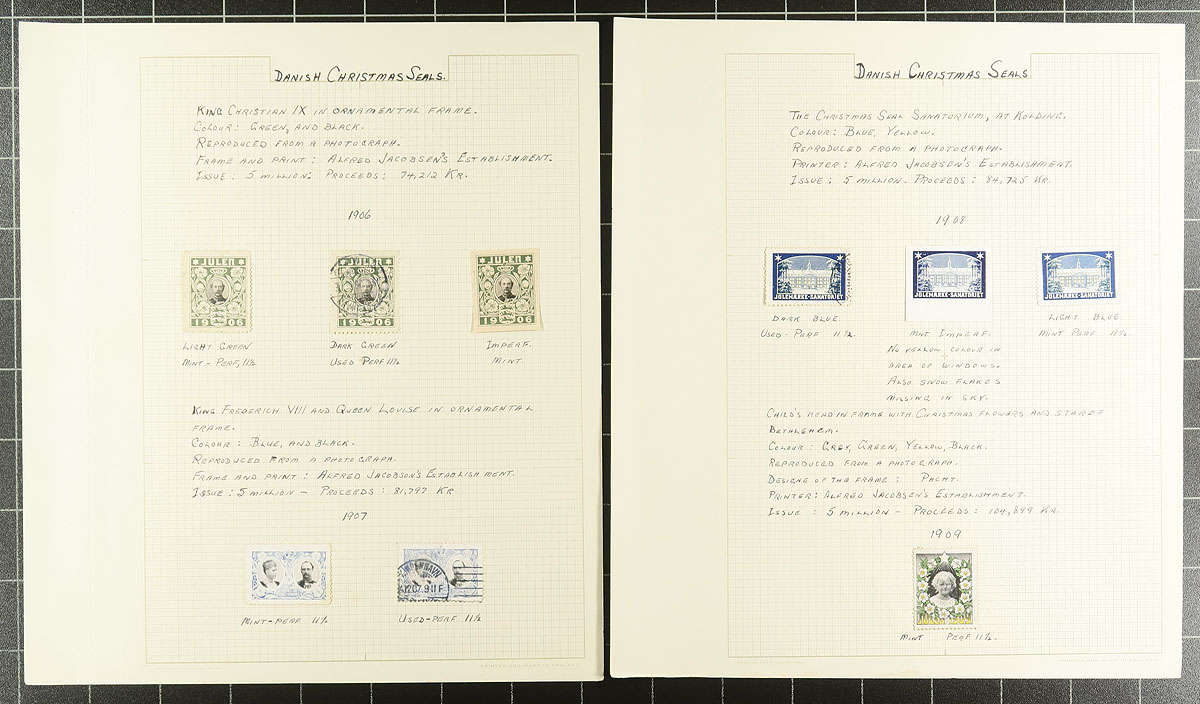 Christmas Seals. Wonderful collection of mint and used Denmark Christmas seals, 1904-1970, containing several hundred seals neatly organized on homemade pages in a springback album. This well developed collection contains a mint and a used seal for each year, along with a mint imperforate stamp and mint blocks for some years, and complete panes from 1952-1970 (including an imperforate sheet for a few years). The collection includes the owner's notations that identified errors, perforations and background information for each issue. A wonderful collection noting items that retail $10 to $30 each, including a 1905 seal on a postal card, ideal for the Christmas Seal, or thematic / topical collector, and should be continued to the present day. Overall fine to very fine. Estimate =