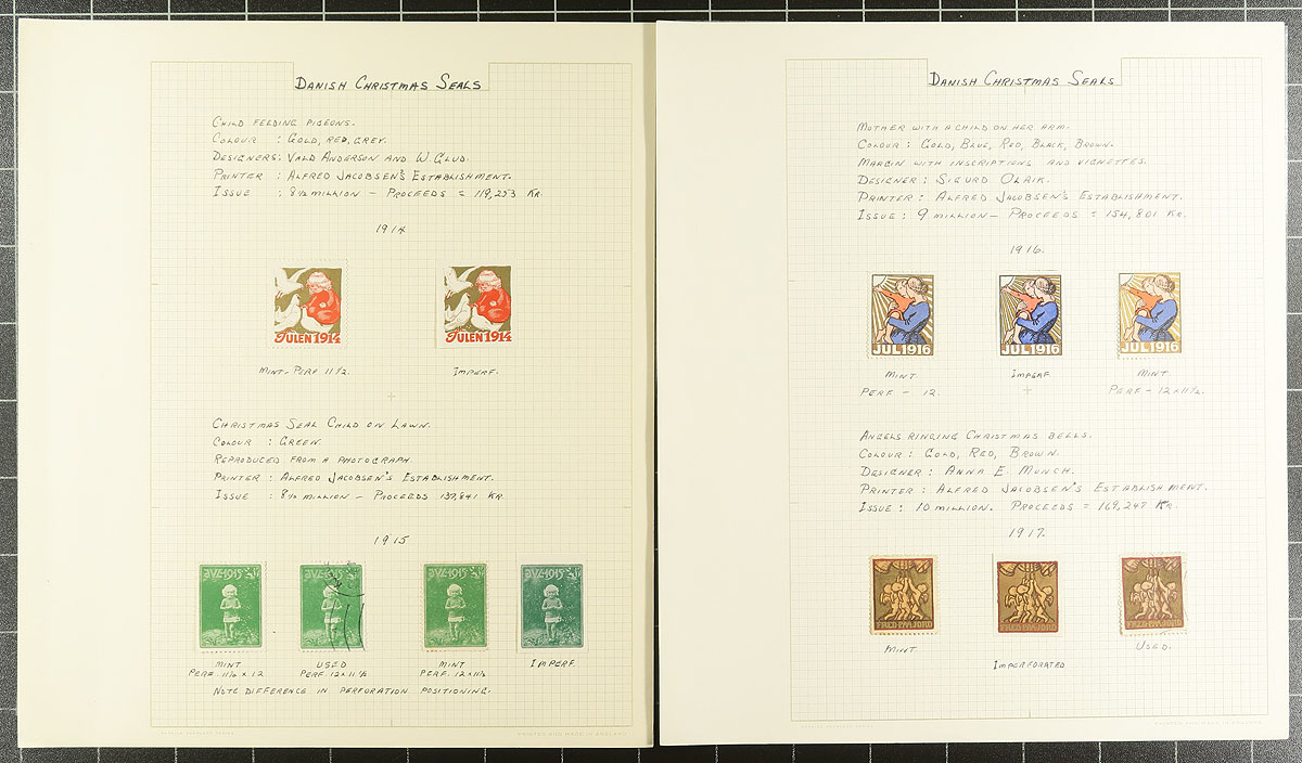 Christmas Seals. Wonderful collection of mint and used Denmark Christmas seals, 1904-1970, containing several hundred seals neatly organized on homemade pages in a springback album. This well developed collection contains a mint and a used seal for each year, along with a mint imperforate stamp and mint blocks for some years, and complete panes from 1952-1970 (including an imperforate sheet for a few years). The collection includes the owner's notations that identified errors, perforations and background information for each issue. A wonderful collection noting items that retail $10 to $30 each, including a 1905 seal on a postal card, ideal for the Christmas Seal, or thematic / topical collector, and should be continued to the present day. Overall fine to very fine. Estimate =