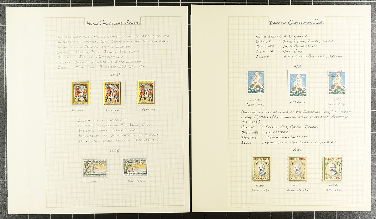 Christmas Seals. Wonderful collection of mint and used Denmark Christmas seals, 1904-1970, containing several hundred seals neatly organized on homemade pages in a springback album. This well developed collection contains a mint and a used seal for each year, along with a mint imperforate stamp and mint blocks for some years, and complete panes from 1952-1970 (including an imperforate sheet for a few years). The collection includes the owner's notations that identified errors, perforations and background information for each issue. A wonderful collection noting items that retail $10 to $30 each, including a 1905 seal on a postal card, ideal for the Christmas Seal, or thematic / topical collector, and should be continued to the present day. Overall fine to very fine. Estimate =