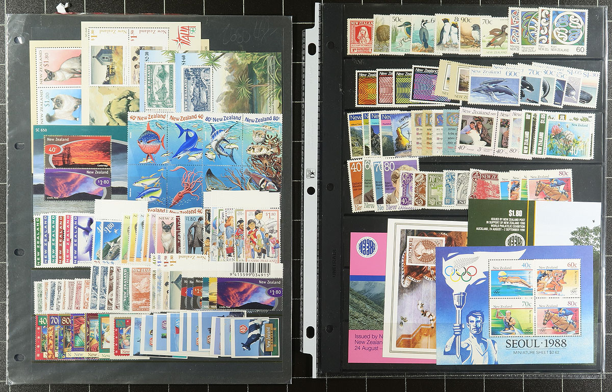 Nice collection / accumulation of primarily never hinged New Zealand, 1953-2003, containing roughly 725 stamps in roughly 15 stock pages. The lot generally ranges from Scott #288/1849, containing mostly sets, along with a few souvenir sheets, booklets, and semi-postal issues. A spot check indicated some material cataloguing $10 and up each, with the owner's 2018 Scott catalogue value for the lot totals US$1,093.00 ($1475.55 CDN), face value alone would be several hundreds dollars. A nice clean lot for collectors and dealers alike, with mild duplication throughout. Estimate =