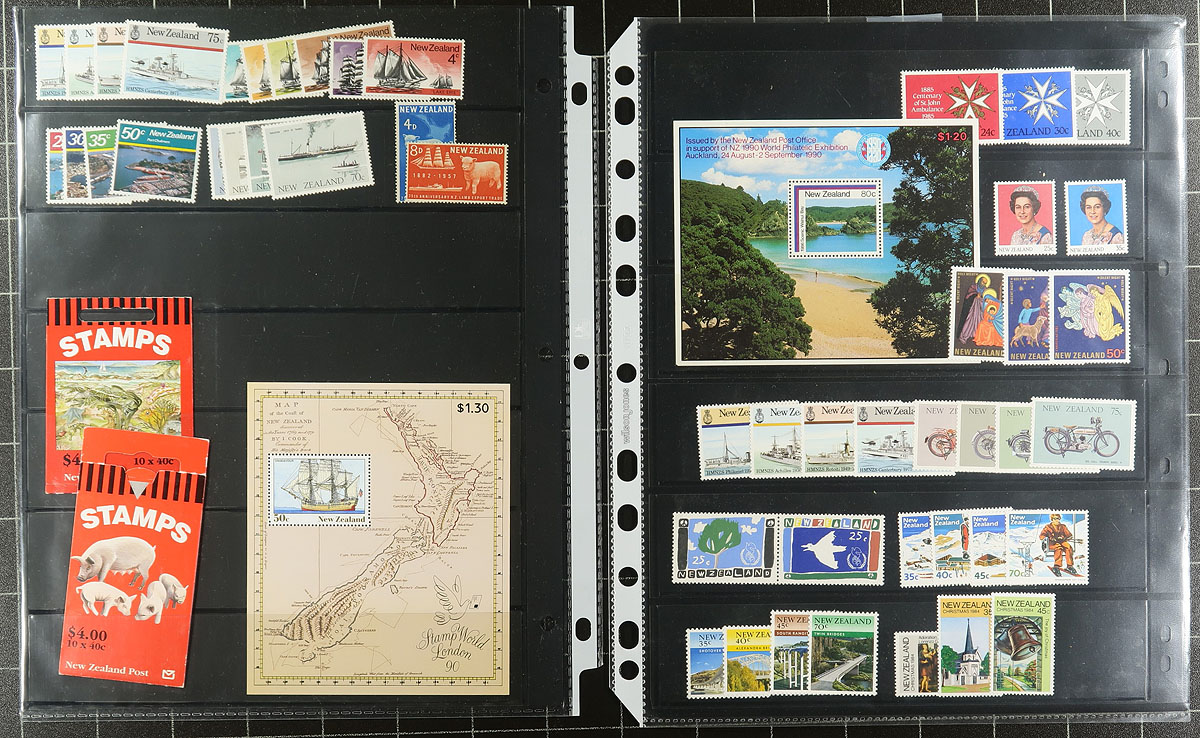 Nice collection / accumulation of primarily never hinged New Zealand, 1953-2003, containing roughly 725 stamps in roughly 15 stock pages. The lot generally ranges from Scott #288/1849, containing mostly sets, along with a few souvenir sheets, booklets, and semi-postal issues. A spot check indicated some material cataloguing $10 and up each, with the owner's 2018 Scott catalogue value for the lot totals US$1,093.00 ($1475.55 CDN), face value alone would be several hundreds dollars. A nice clean lot for collectors and dealers alike, with mild duplication throughout. Estimate =